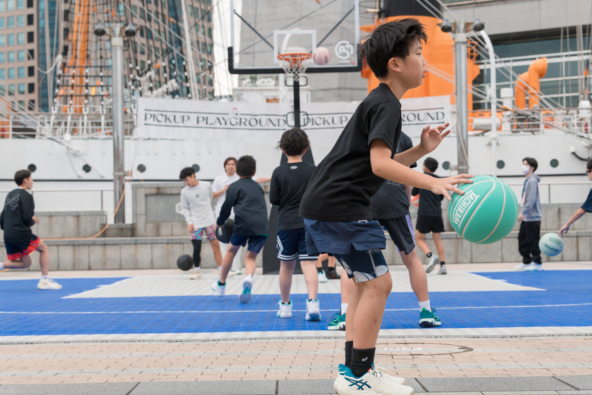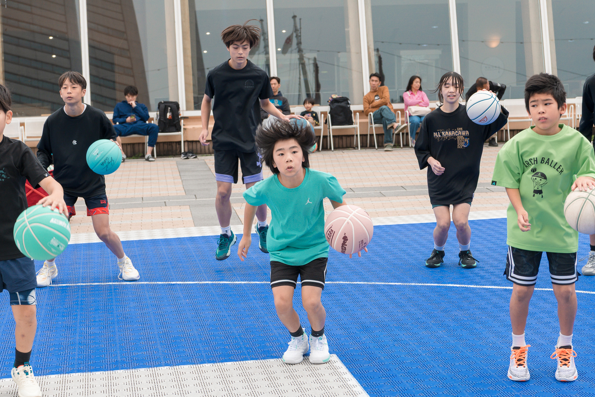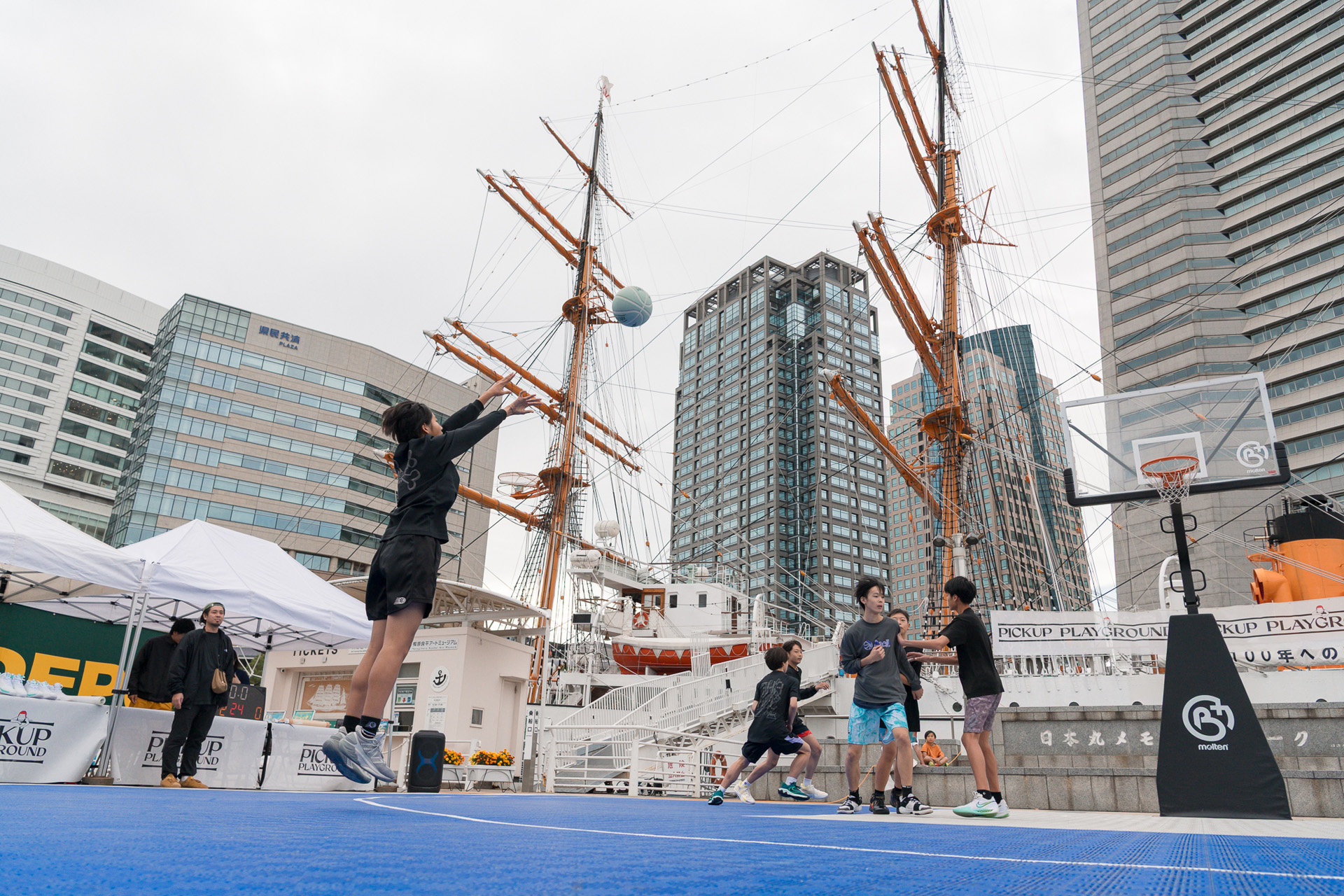 帆船・日本丸と高層ビル群に囲まれた開放的なロケーション。子どもたちの声、ボールの跳ねる音、そして笑顔。みなとみらいの景色に、バスケットボールが自然に溶け込んでいった。