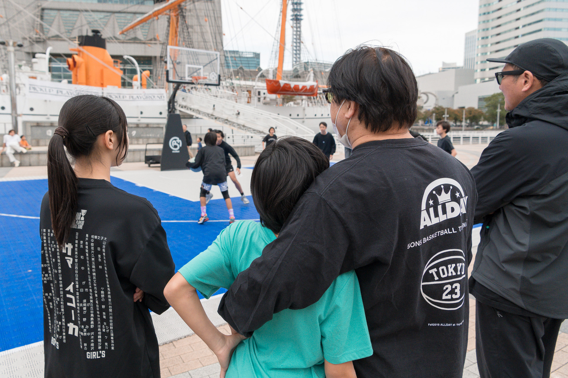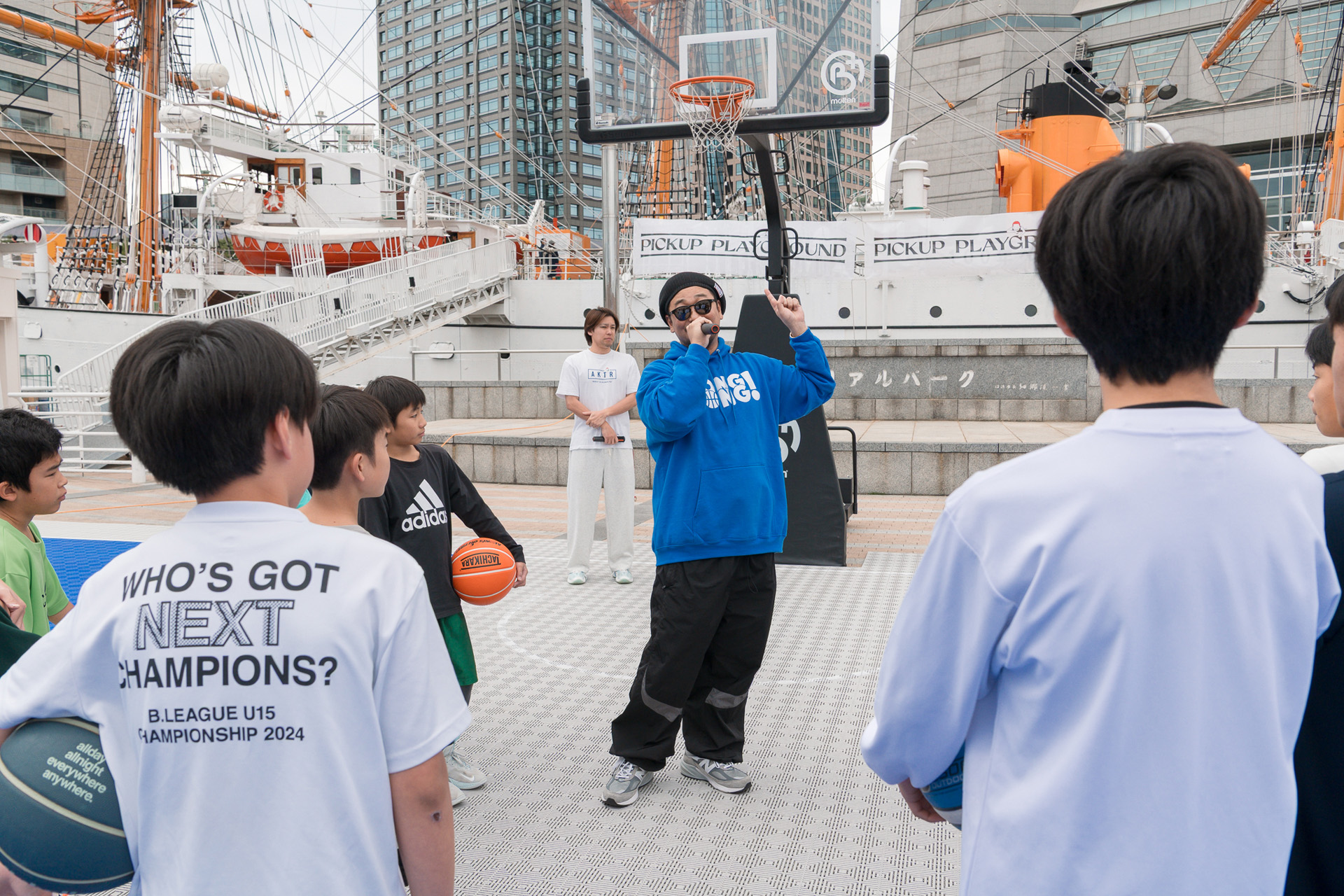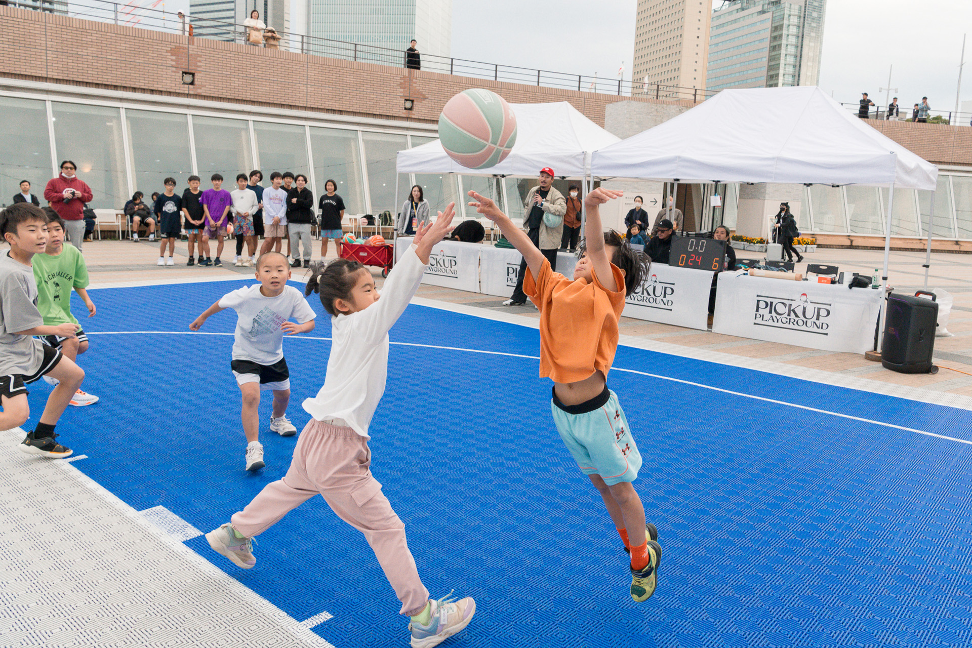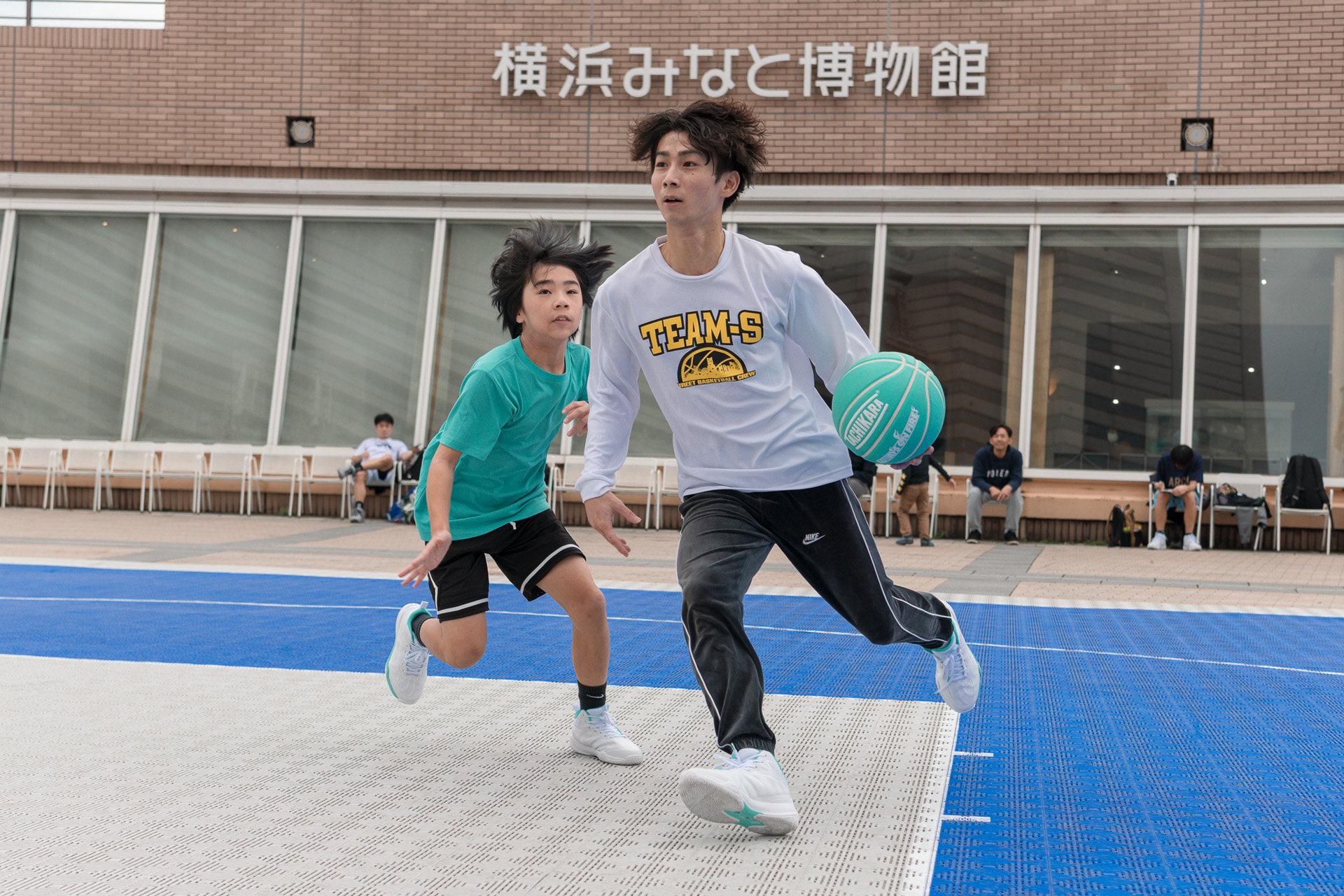 帆船・日本丸と高層ビル群に囲まれた開放的なロケーション。子どもたちの声、ボールの跳ねる音、そして笑顔。みなとみらいの景色に、バスケットボールが自然に溶け込んでいった。