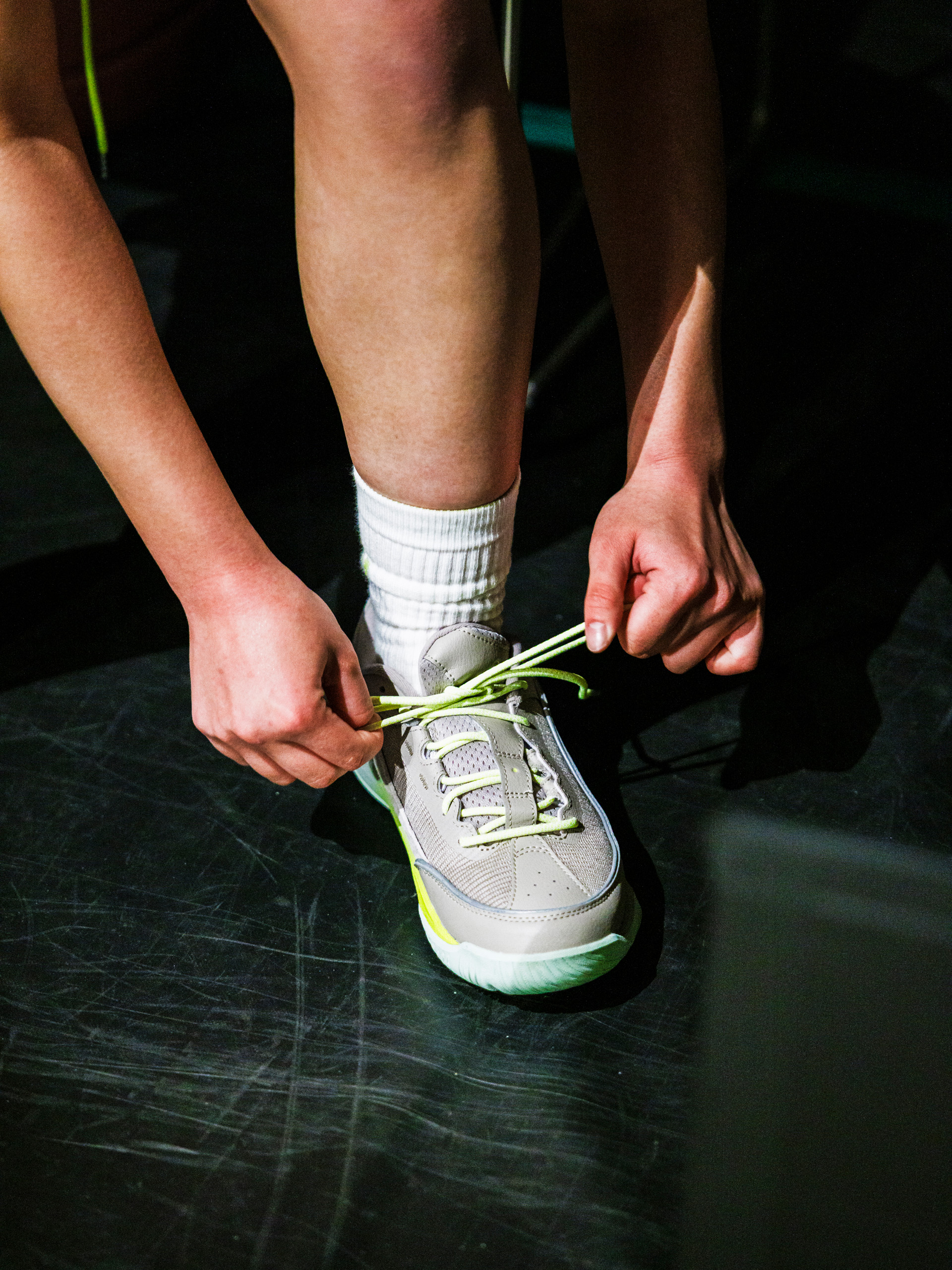 カラーリングは2色で、ブラックは僕らも作ったことがなかったし、理想は街履きもできて、プレーグラウンドに行ったら紐を結んでプレーして、そのまま帰れるシューズです。リフレクターラインも大胆に入れています。もう一色は落ち着いたカラーの中に、初期衝動の要素を入れたくて、シューズの内側だけにイエローのグラデーションを入れました。
