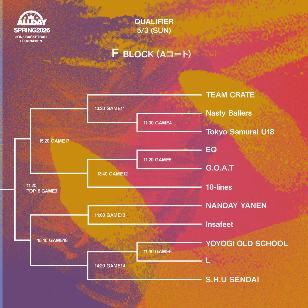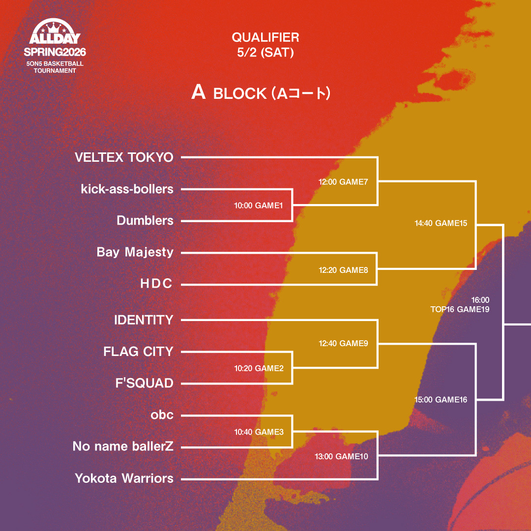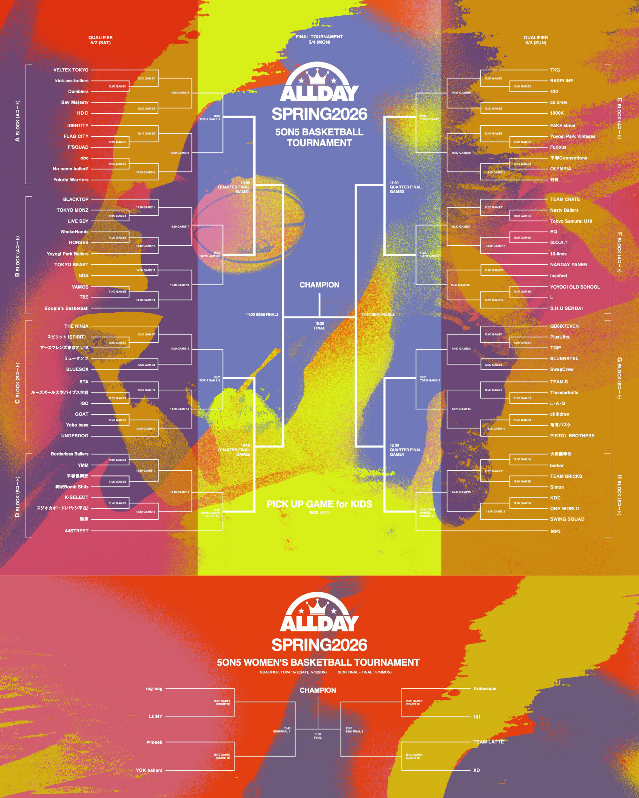 2日(土)にA〜Dブロック、3日(日)にE〜Hブロックを消化し、各ブロックを勝ち抜いた8チームが最終日4日のベスト8からファイナルトーナメントへ。ここで第50代ALLDAY王者が決まる流れだ!