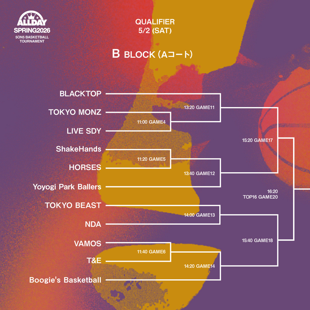 Yoyogi Park Ballers、秦啓大率いるLIVE SDY、調子を上げてきている古豪TOKYO BEAST、埼玉の競合ShakeHands、ヤングボーイズNDAと、実力差がほとんど見えない並び、どう転ぶか。
