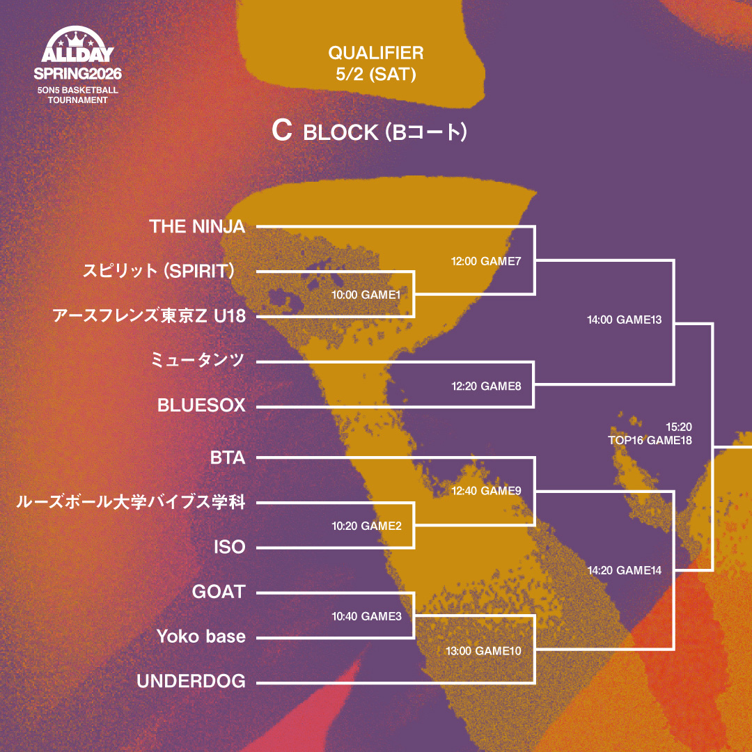 前回ベスト8のS.H.U SENDAIが軸。前回ベスト16のTEAM CRATEを中心に、大阪名物カッシー率いるNANDAY YANEN、YOYOGI PLAYGROUNDの宝LUKIAを擁するNasty Ballers、トップエンドなユースTokyo Samurai U18、SOMECITY CHIBAのEQ、新潟のInsafeet。タレント揃いの注目ブロックだ。