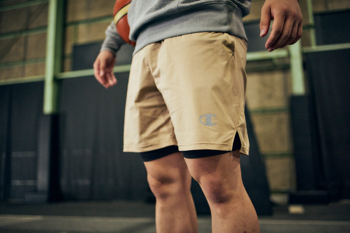 ショーツは、リサイクルポリエステル100%の光沢ある吸汗速乾素材を使用し、トレンドのショート丈を採用しており「僕は丈が短い方が好きです」という彼の好みにもマッチしたスタイリングになっている。左裾にChampion ロゴを刺繍し、ウエスト部分を配色切替えにして、サイドにラインテープを入れたデザインが目を引くほか、両サイドにポケットも付いている。