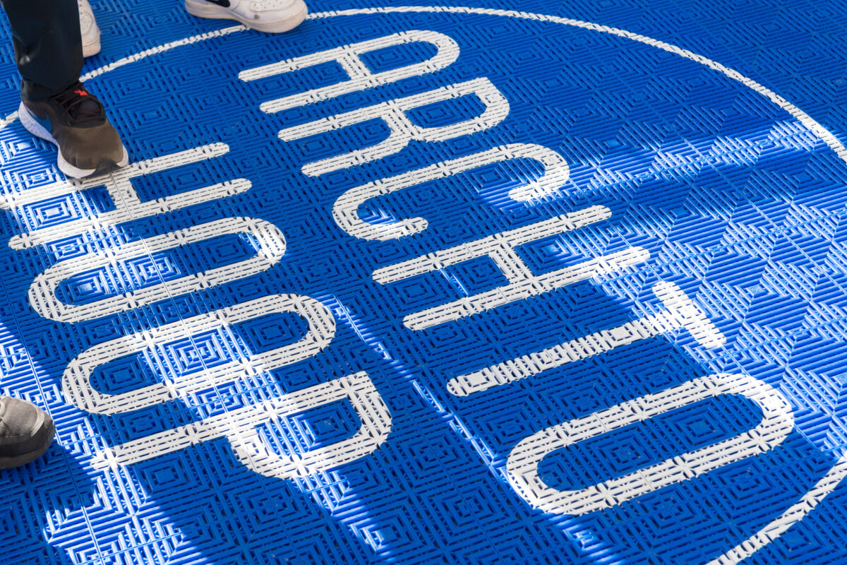 特別な体育館がなくても、街なかや商業施設、空き地や駐車場に短時間で設営できる。