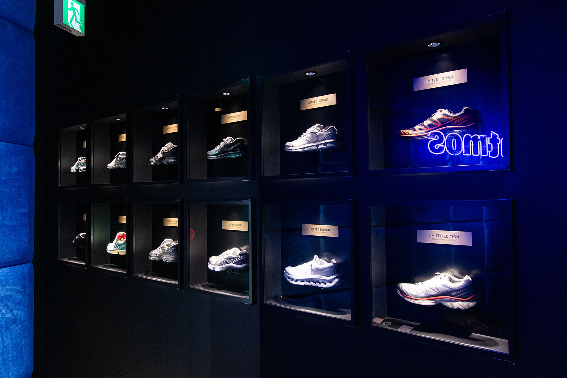 2Fへ着くと、高級感のあるゴールドディスクウォールにatmosがフォーカスするスニーカーのラインナップ。「VIP ROOM」を彷彿させる空間へ入り進むと、スピーカーが背景にデザインされたユニークなスニーカーウォール、そして、アクリルパイプにライトを通しネオン管を意識したスニーカーウォールとアパレルラックがウィンドウ沿いに配置されている。