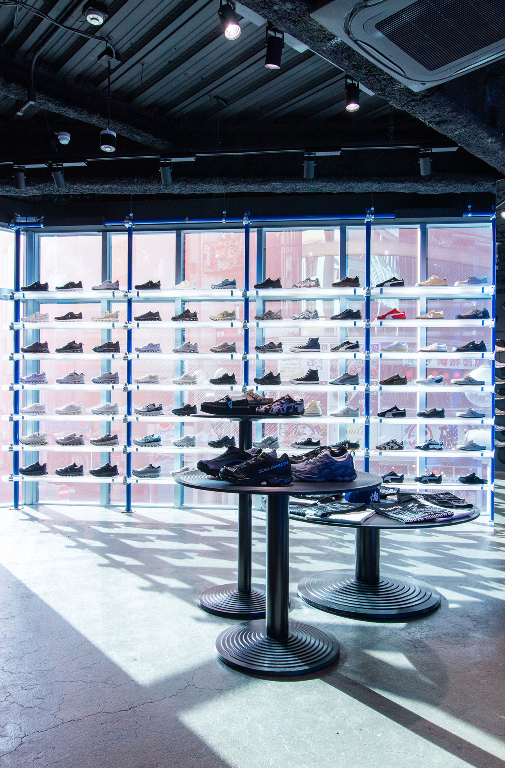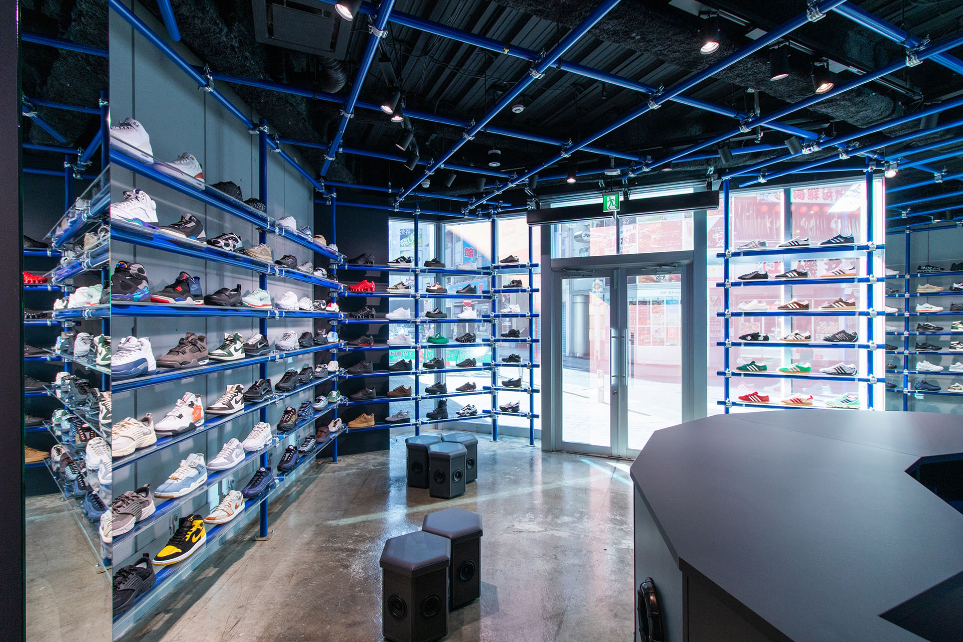 外観はブランドカラーであるブルーのミラーシートを纏い、クラブのホールをイメージした1Fに入ると、スピーカーのデザインで作られたインパクトのあるレジカウンターが登場。ウィンドウ沿いにはスニーカーウォールが全面に設置され、活気ある雰囲気となっている。また、「VIP ROOM」へ繋がるような、ムードのある2Fへの階段は特別な気分を高めてくれる。