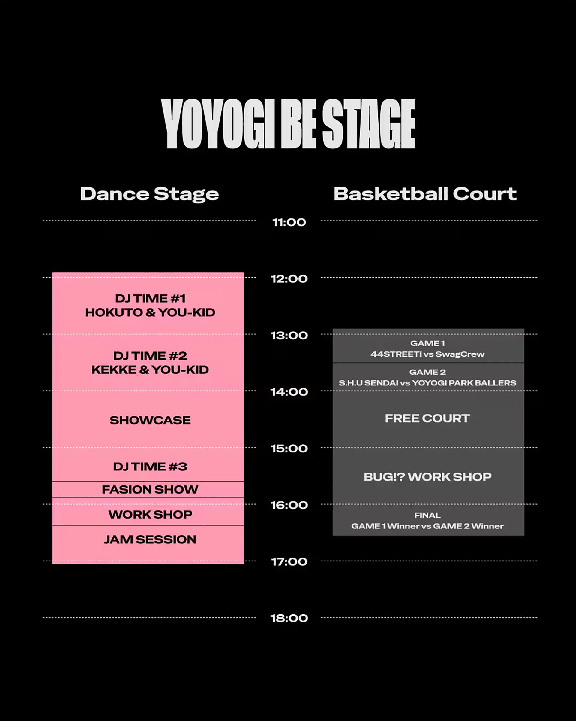 さらに、代々木公園の「BE STAGE」では、ダンスとバスケットボールのコンテンツを展開。ダンスでは、ダンスカルチャーに精通し、シーンから厚い信頼を集める「Akanen」と「Miyu」をアンバサダーに迎え、ショウケースやファッションショウ、参加型のフリーサイファーが行われる。