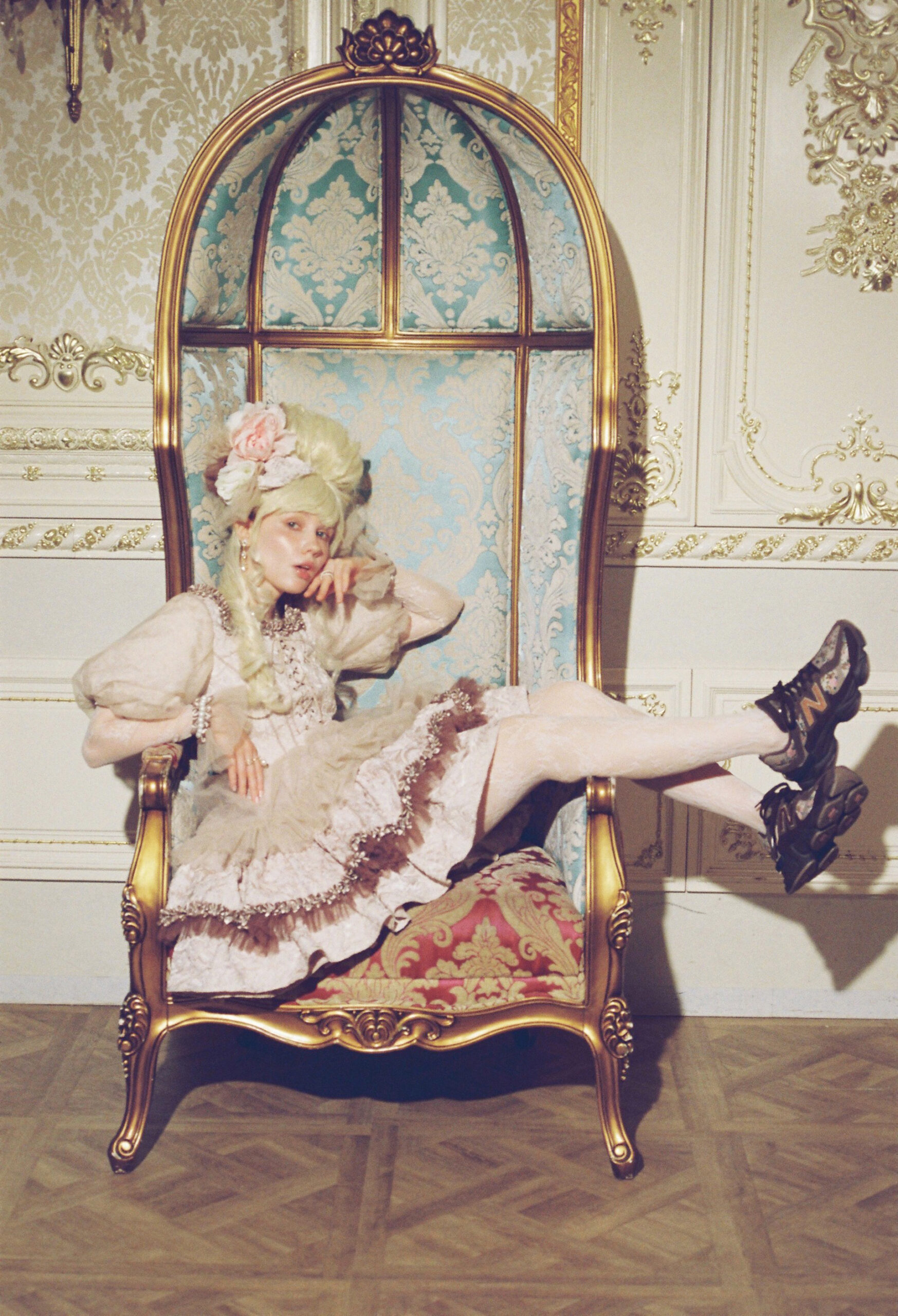 デザインのテーマは”Timeless Beauty”。18世紀ヴェルサイユ宮殿のゴブラン織花柄と、マリー・アントワネットの世界観にインスピレーションを受けており、貴族のエレガントなスタイルを「atmos pink」らしくストリートへと昇華している。