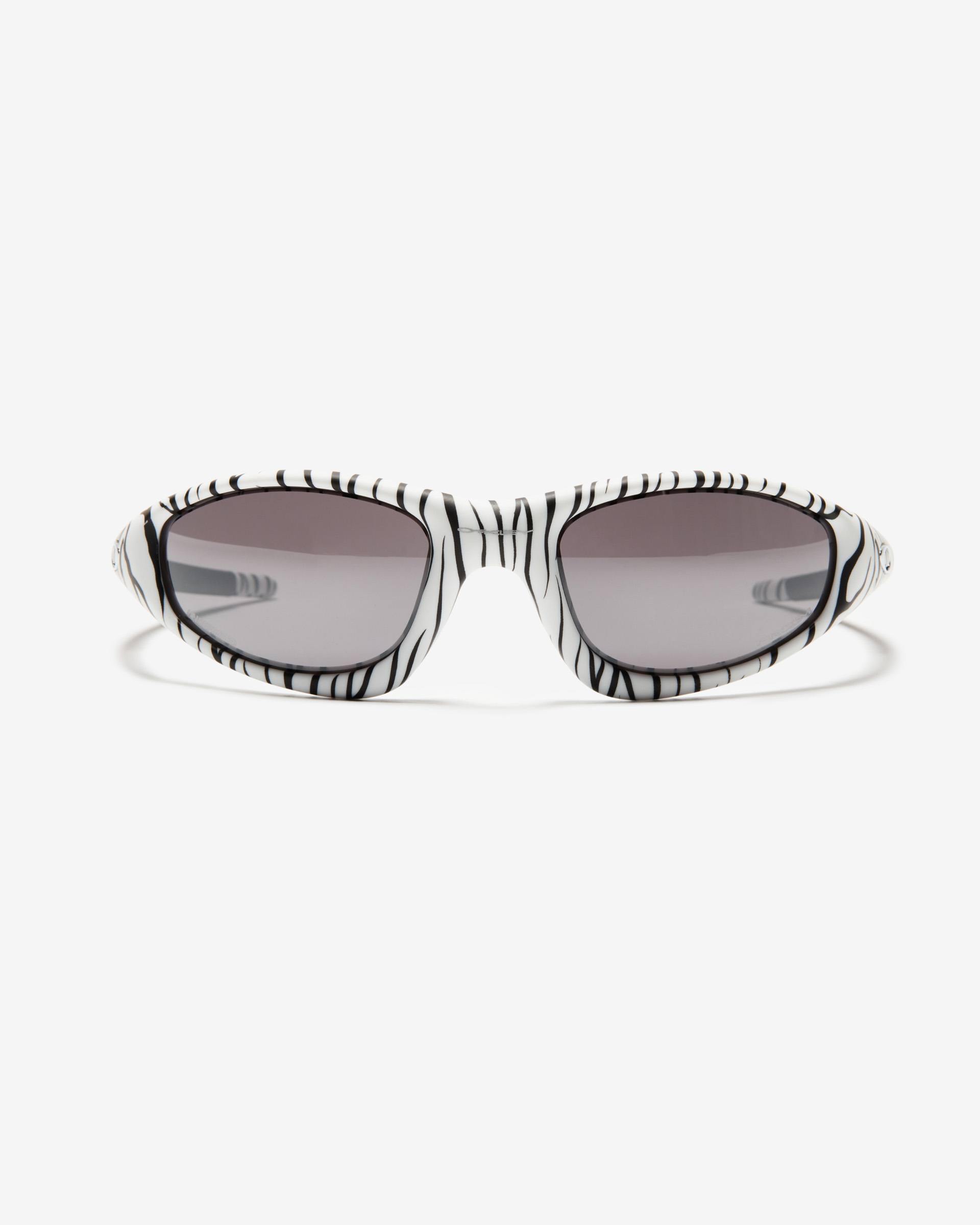 オークリーの第⼆世代Straight Jacket®を再リリースした本モデル「MUZM」は、⼤胆なホワイトベンガルプリントが特徴。