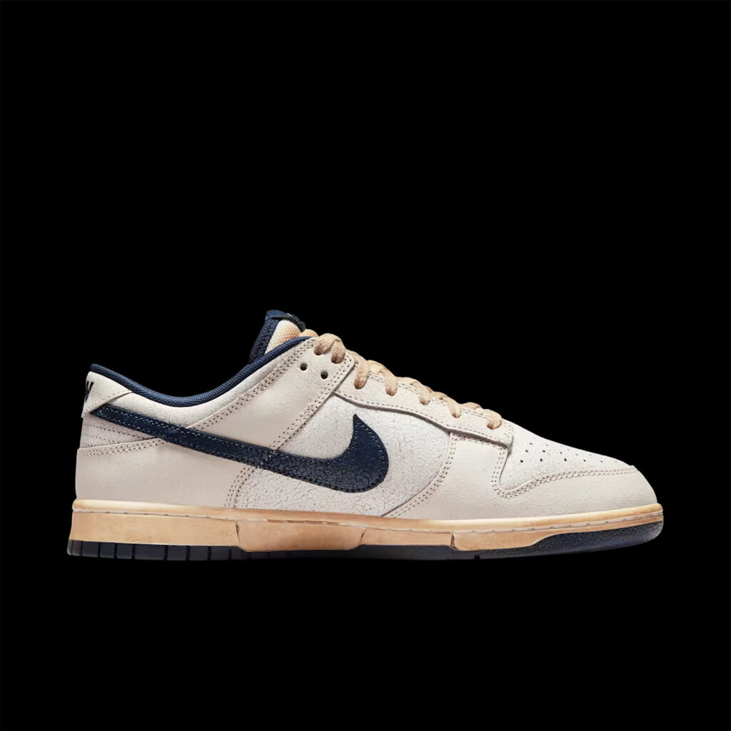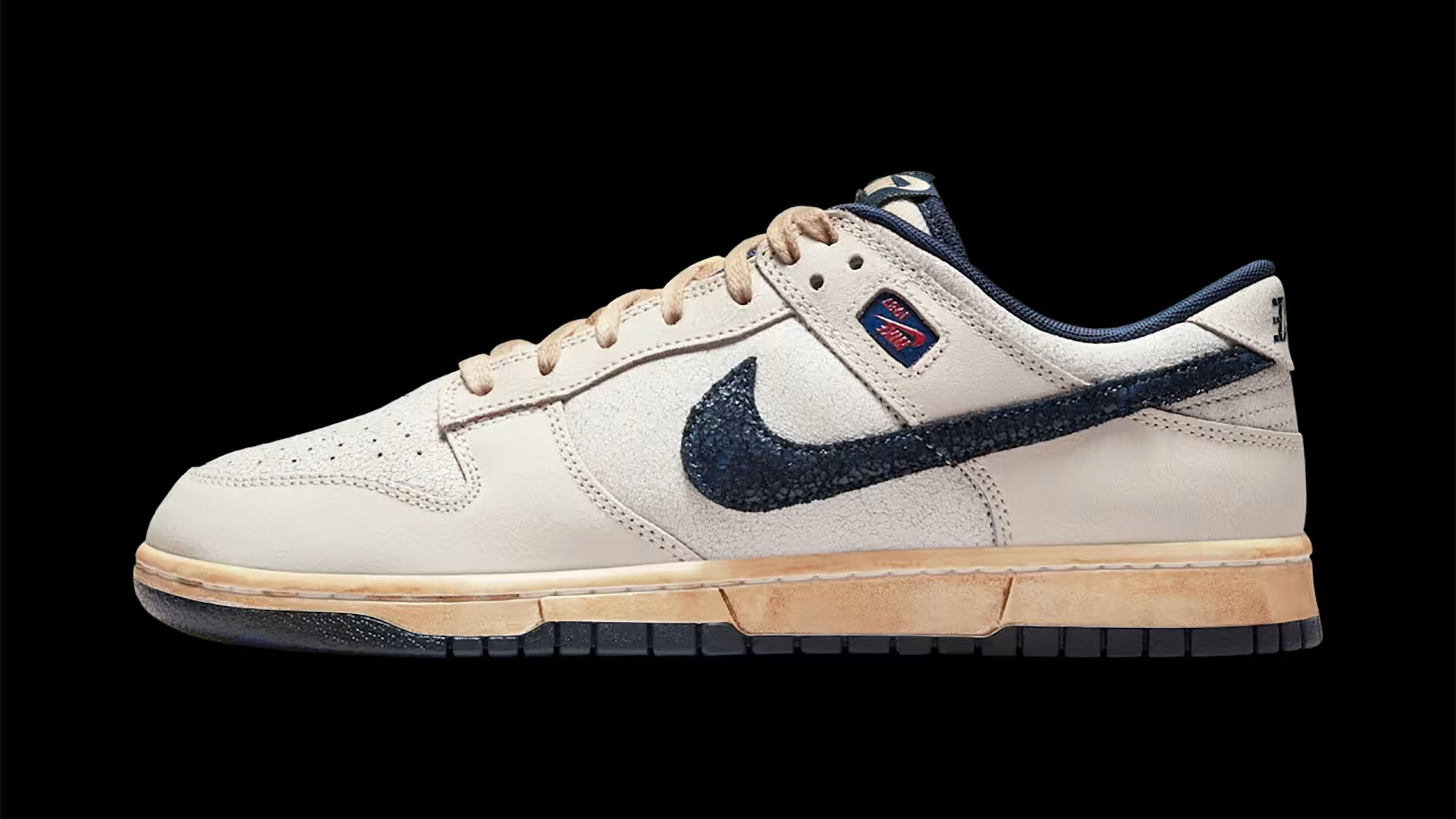 このダンク LOWをどう説明すればいいのか、正直よく分からない。まるでどこかで38年間も時間が止まっていたかのようだ。レザーは使い込まれたようにひび割れ、シューレースやミッドソールも長い年月で変化したような色合いだ。1987年に作られたシューズなら、納得できる。だが、ロゴだけは理解できない。逆さまなのだから。