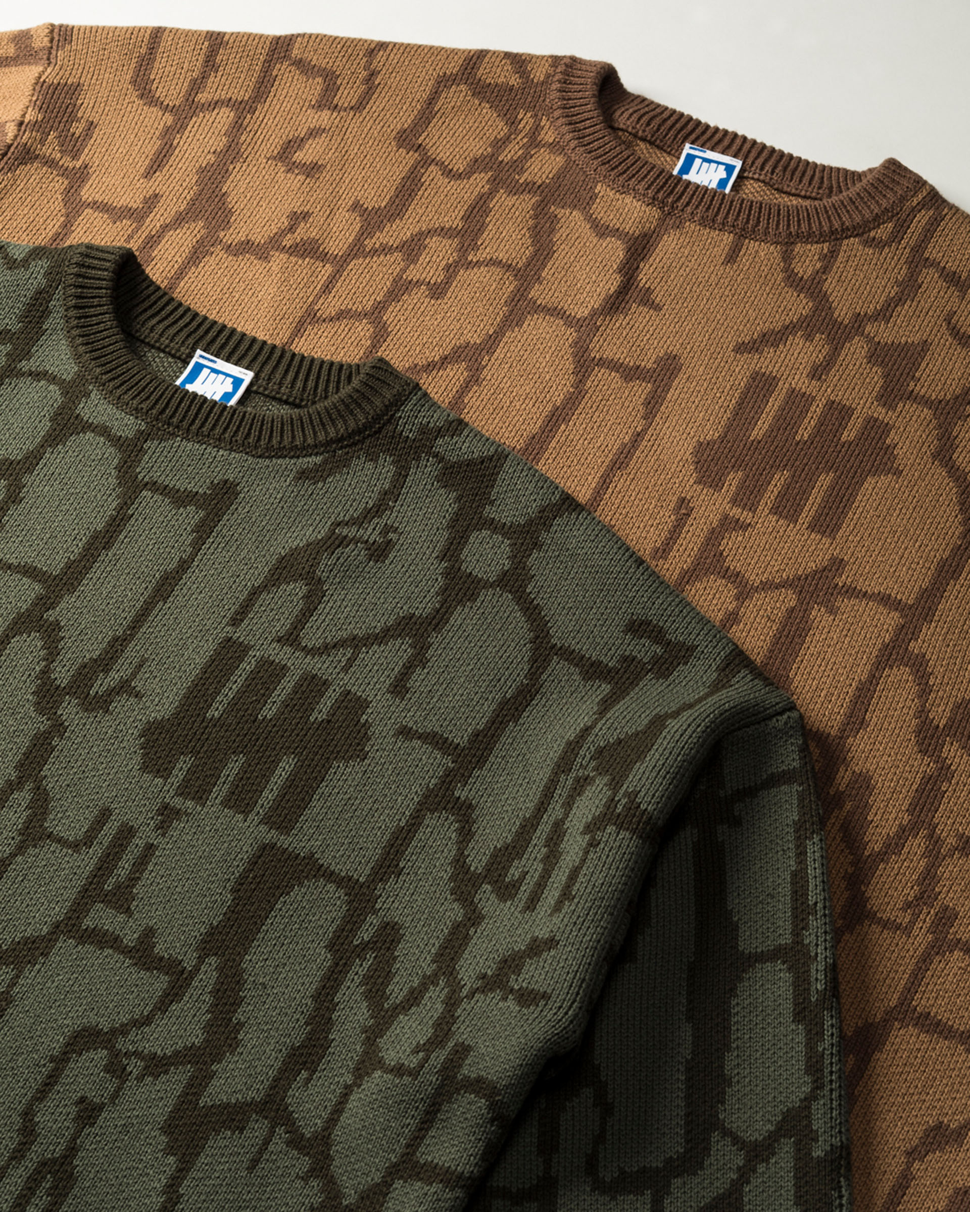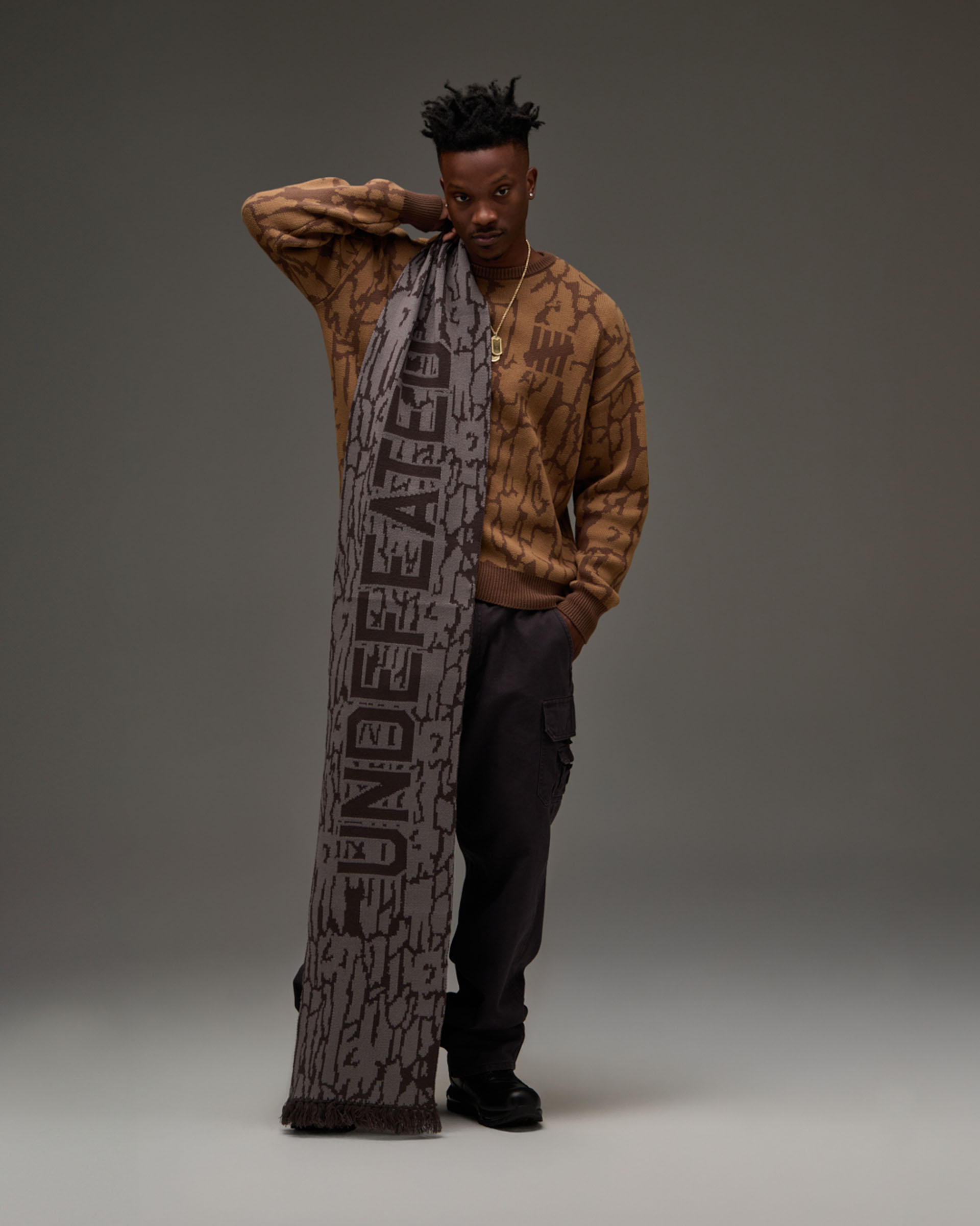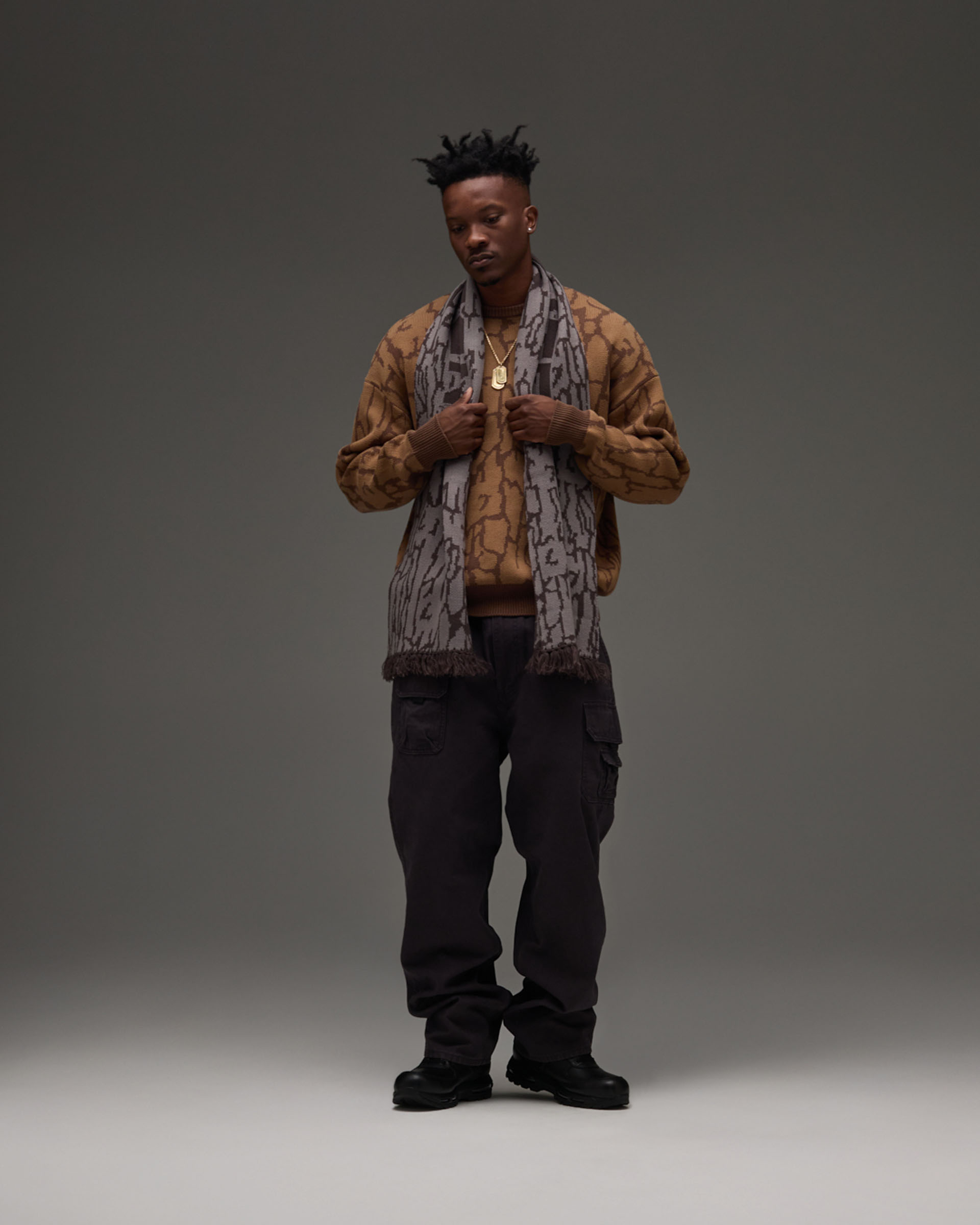 代表的なルックで採⽤されているのは、無⾻な樹⽪を模した”BARK CAMO”のニットウェア。そして左胸に5-Strikeマークがあしらわれたトップスと、全⾯にブランドロゴを配したマフラーが登場する。