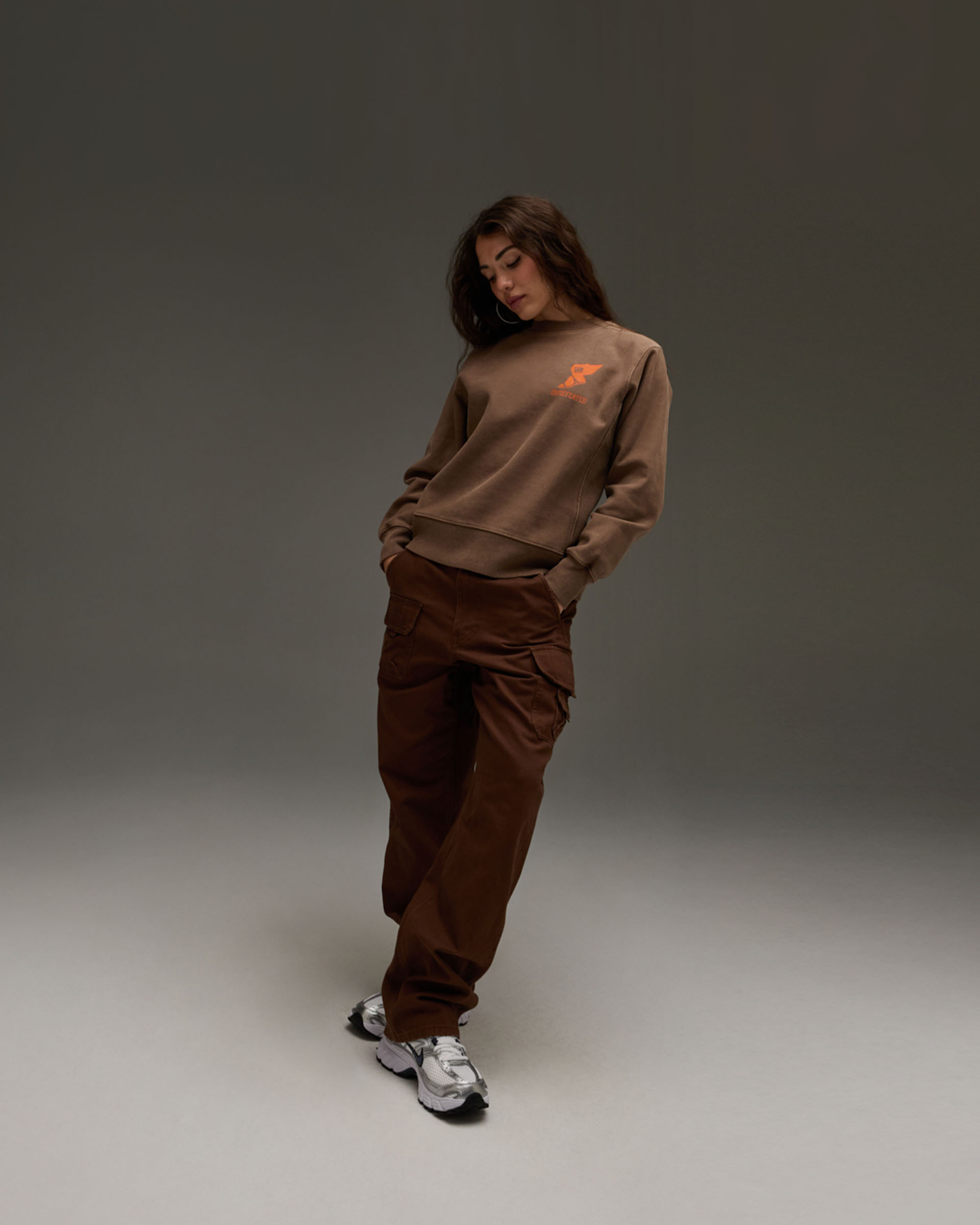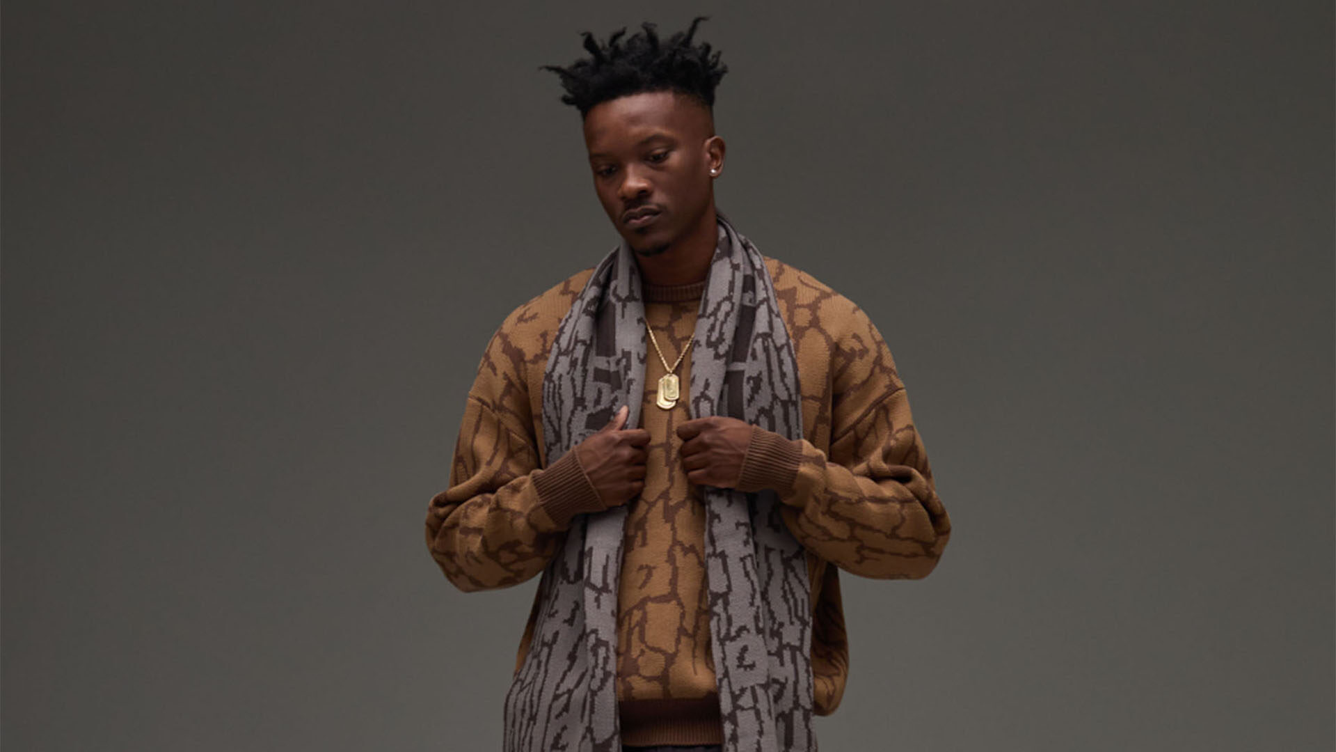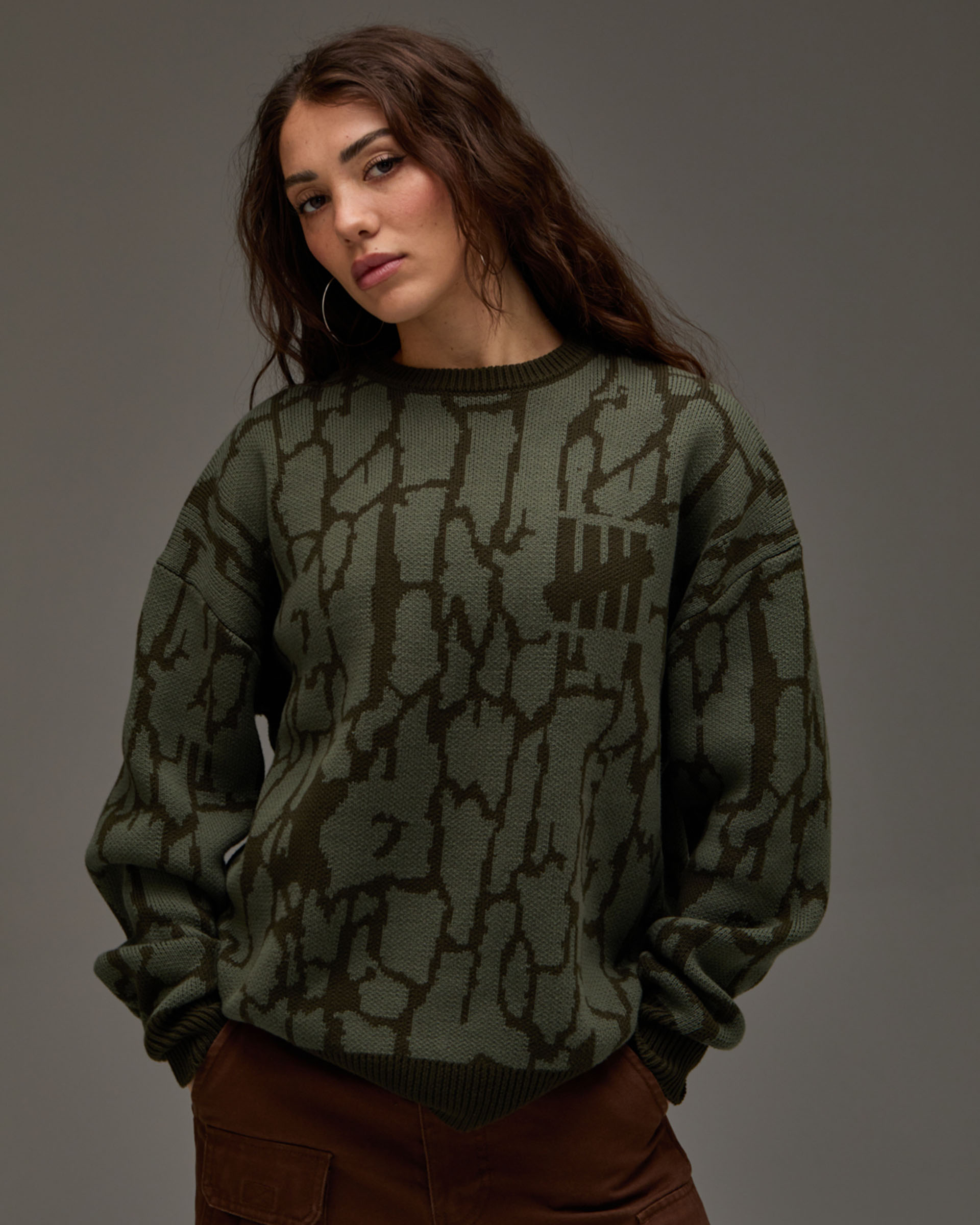 代表的なルックで採⽤されているのは、無⾻な樹⽪を模した”BARK CAMO”のニットウェア。そして左胸に5-Strikeマークがあしらわれたトップスと、全⾯にブランドロゴを配したマフラーが登場する。