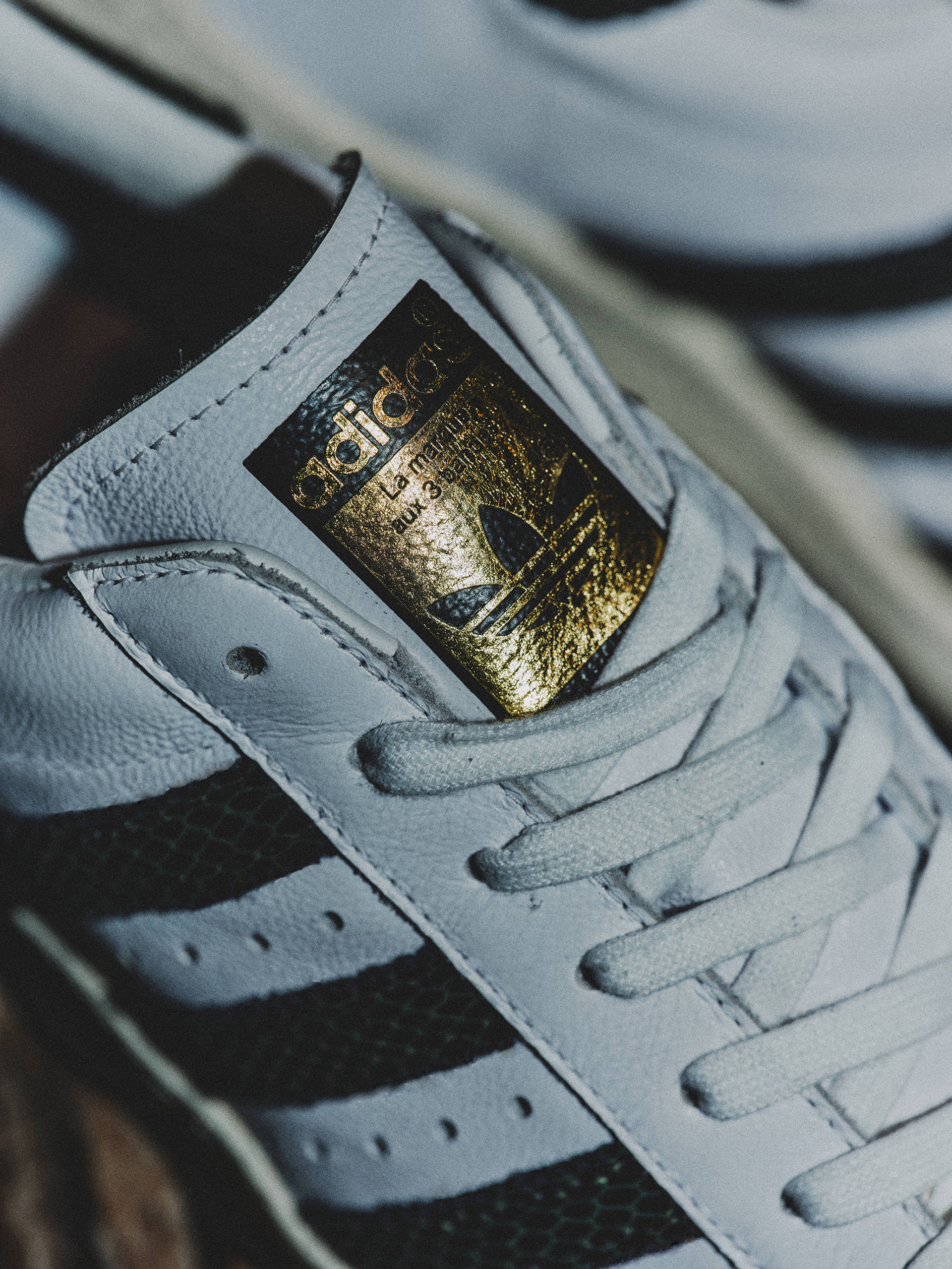 今作は、1970年にリリースされた「adidas Originals」の名作”SUPERSTAR”の中でも、アイコニックなモデルの一つとして愛され続けている82年製の『SUPERSTAR 82』をモチーフにしており、特徴的なシェルトゥは今も変わらないシンボルであり、滑らかなレザーアッパー、ギザギザのスリーストライプスまで継承。