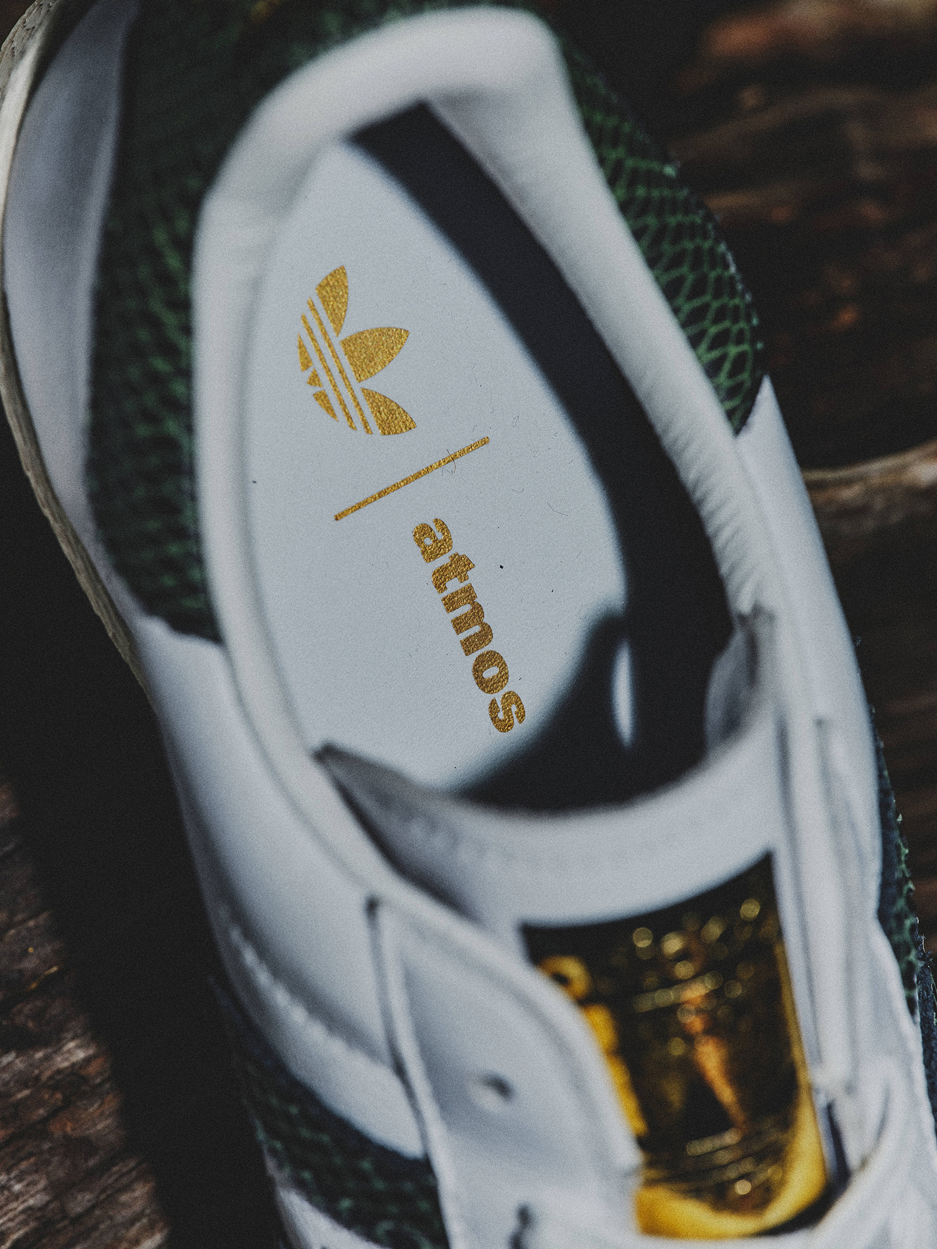 また、「atmos」と「adidas Originals」の別注における象徴的なパターンである”G-SNK” (Glow in the dark-Snake)パターンを採用しており、スリーストライプスとヒール部分には蓄光のスネークスキンが施され、暗闇で光る演出を楽しむことができる。