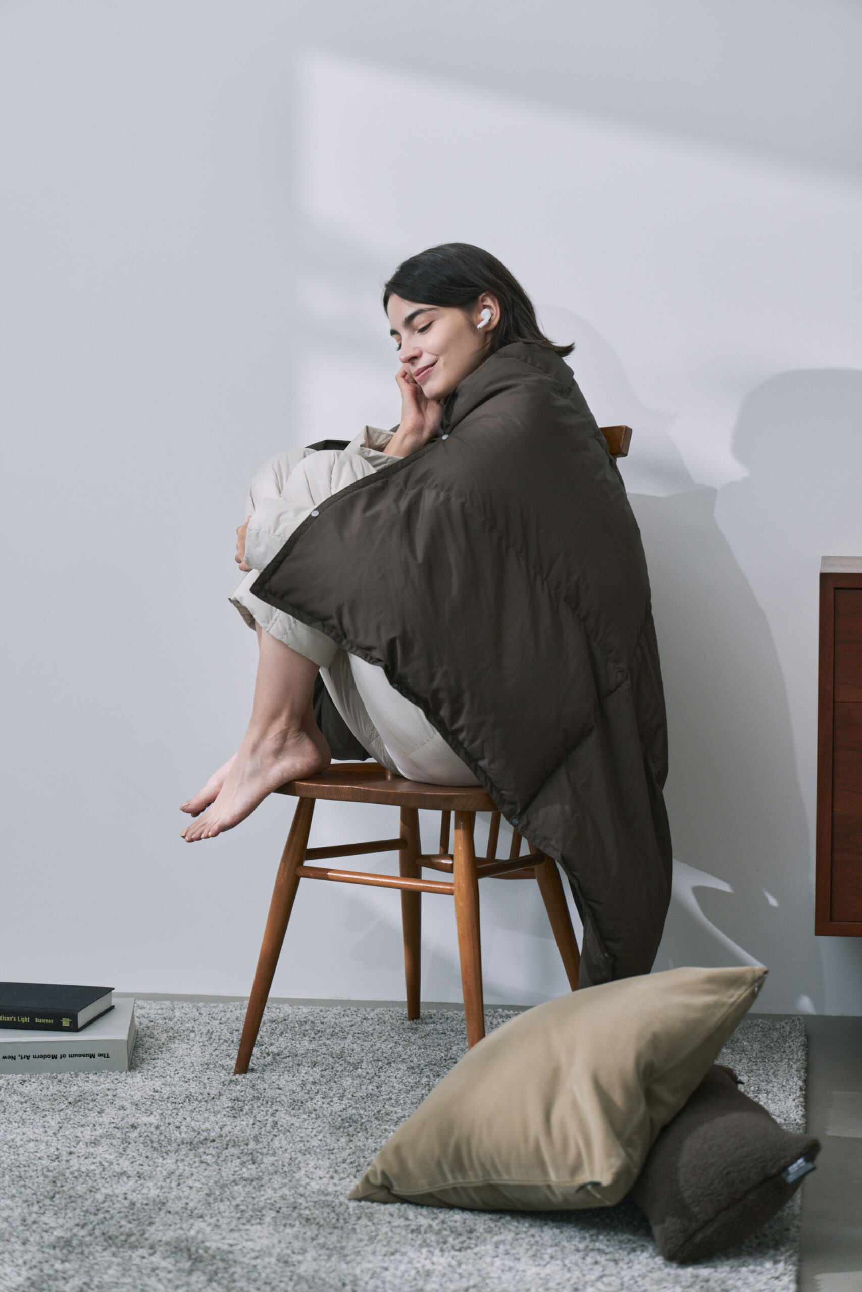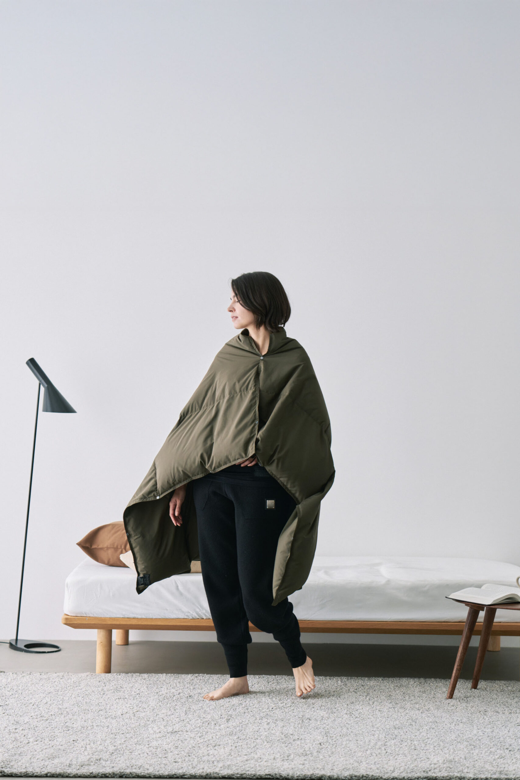 TAIONが提案する新コンセプト「ルームダウン」は、布団・ポンチョ・カーディガンの3WAY仕様に加え、クッションに収納できる。1枚で“掛ける・羽織る・包む・しまう”が完結する、新しい掛け布団の在り方です。