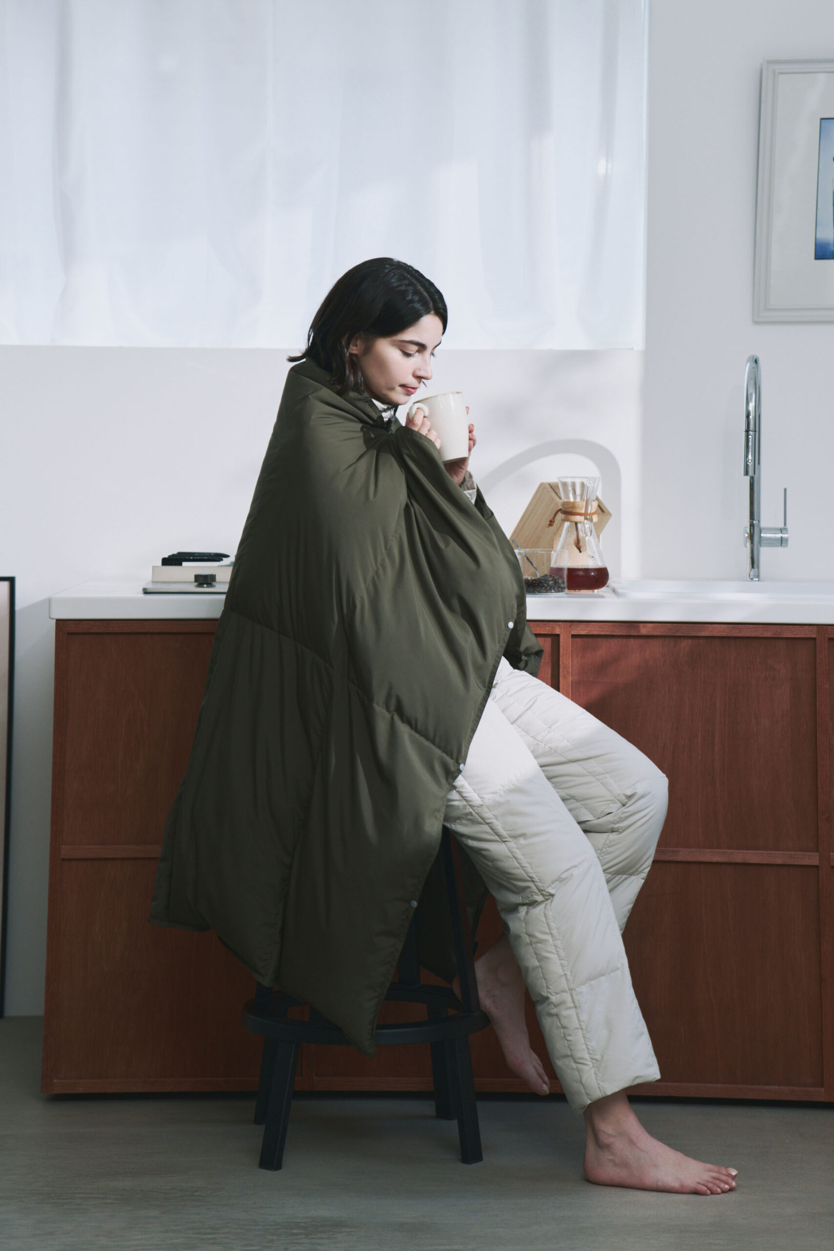 布団としては軽くてあたたかく、羽織ればポンチョやカーディガンのように使える自由な設計。テレビを見ながら、食事をしながら、ゲームをしながら──どんな時間も、ルームダウンに包まれます。使わないときは折りたたんでクッションに収納。インテリアにも馴染み、ソファやベッドサイドにも置きやすい。“しまう”ことまでデザインした、ダウンの新しいかたちです。