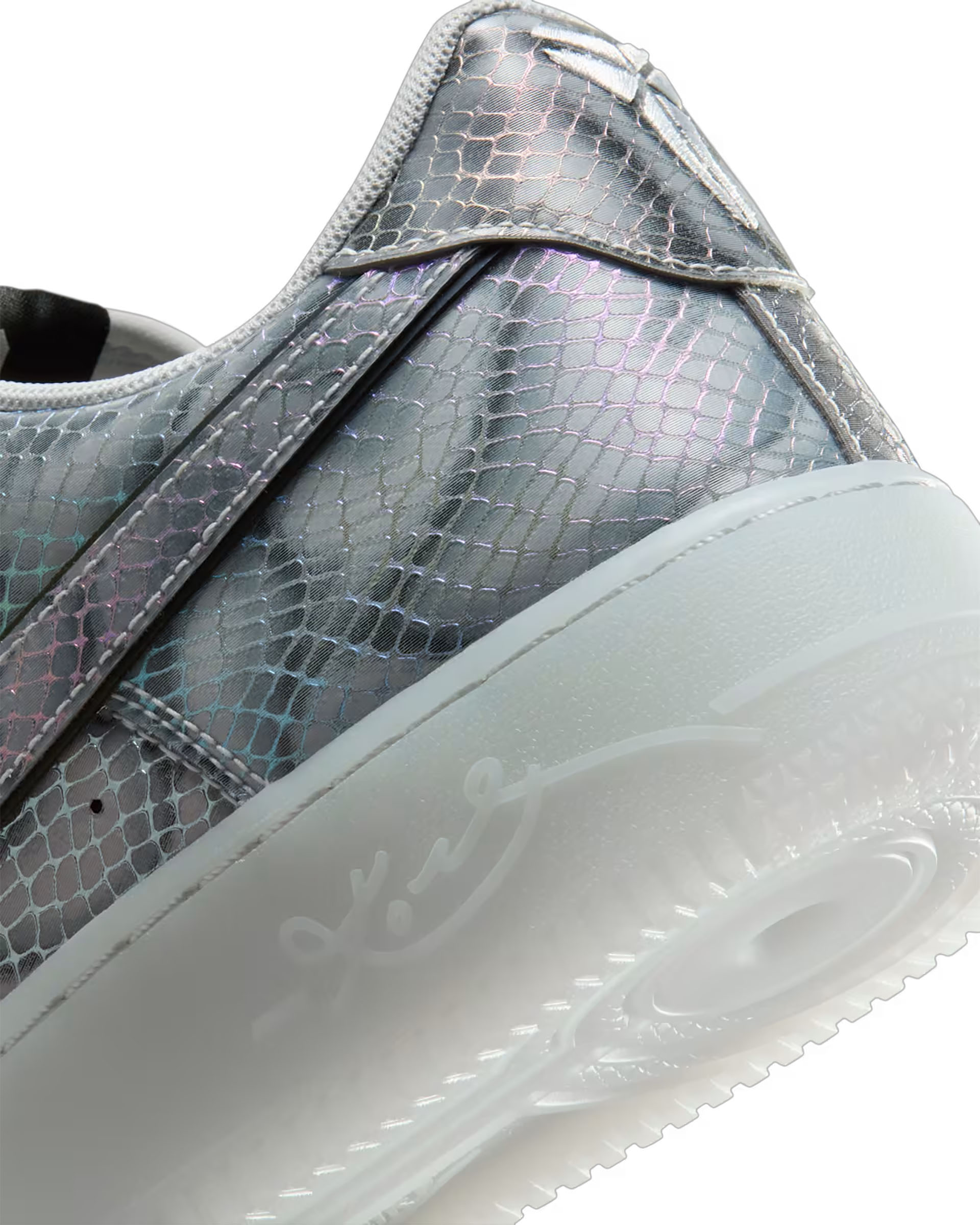 この上ない洗練性を備え、絶えず変化し、あらゆるシーンで活躍する。このスネークパターンをあしらった一足には、モダンな快適性と革新的なビジュアルテクノロジーを融合。パープル、ゴールド、ブラックの色合いの間を移りゆくレンチキュラーのアッパーには、暗闇でも存在感を放つレインボーのSwooshロゴをプラス。エア フォース 1の定番である星のパターンをあしらったアウトソールには代わりにSheathロゴが繰り返され、コービーならではのカスタムデュブレがシューレースを彩る。もちろん、全てのコービー プロトロモデル同様に、考え抜かれ改良されたテクノロジーも搭載。抜群に柔らかい履き心地を誇るReactXフォームとNike Airクッショニングを組み合わせ、究極の快適性を叶える一足に仕上げた。