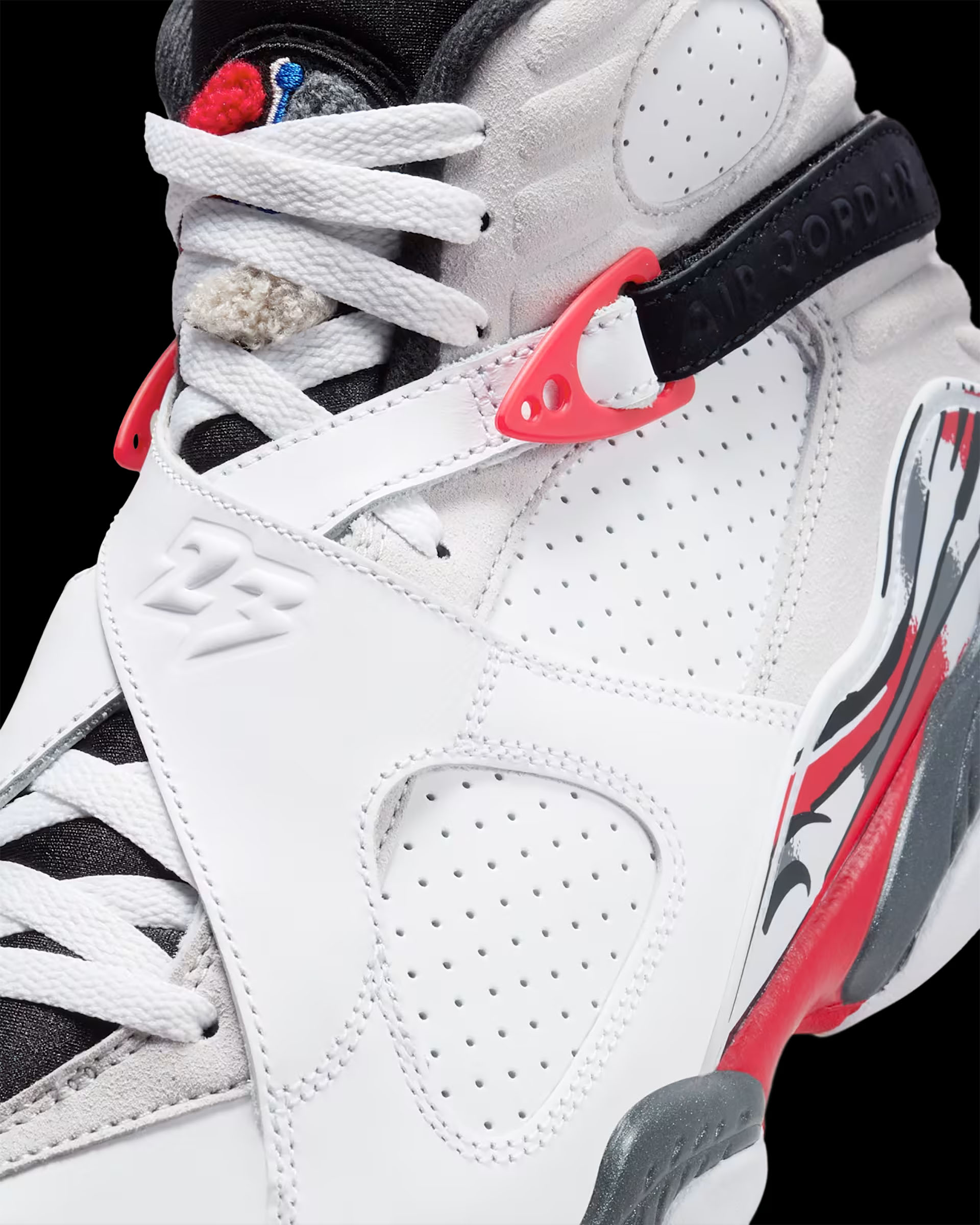 エア ジョーダン 8は、マイケル・ジョーダンの92~93年の優勝シーズンに誕生したクラシックな一足。あのウサギのアニメキャラクターの足元を飾ったことでも知られている。今回のエディションは、そのクラシックさを象徴する成型ディテールとストラップを備え、90年代らしいホワイトのレザーアッパーに、グレーのスエードアクセントと存在感のあるトゥルーレッドを組み合わせたデザイン。シュータンのジャンプマンは鮮やかなブルーでひときわ際立つ。まさにHare Jordan(ウサギのジョーダン)と呼ぶにふさわしいモデルだ。