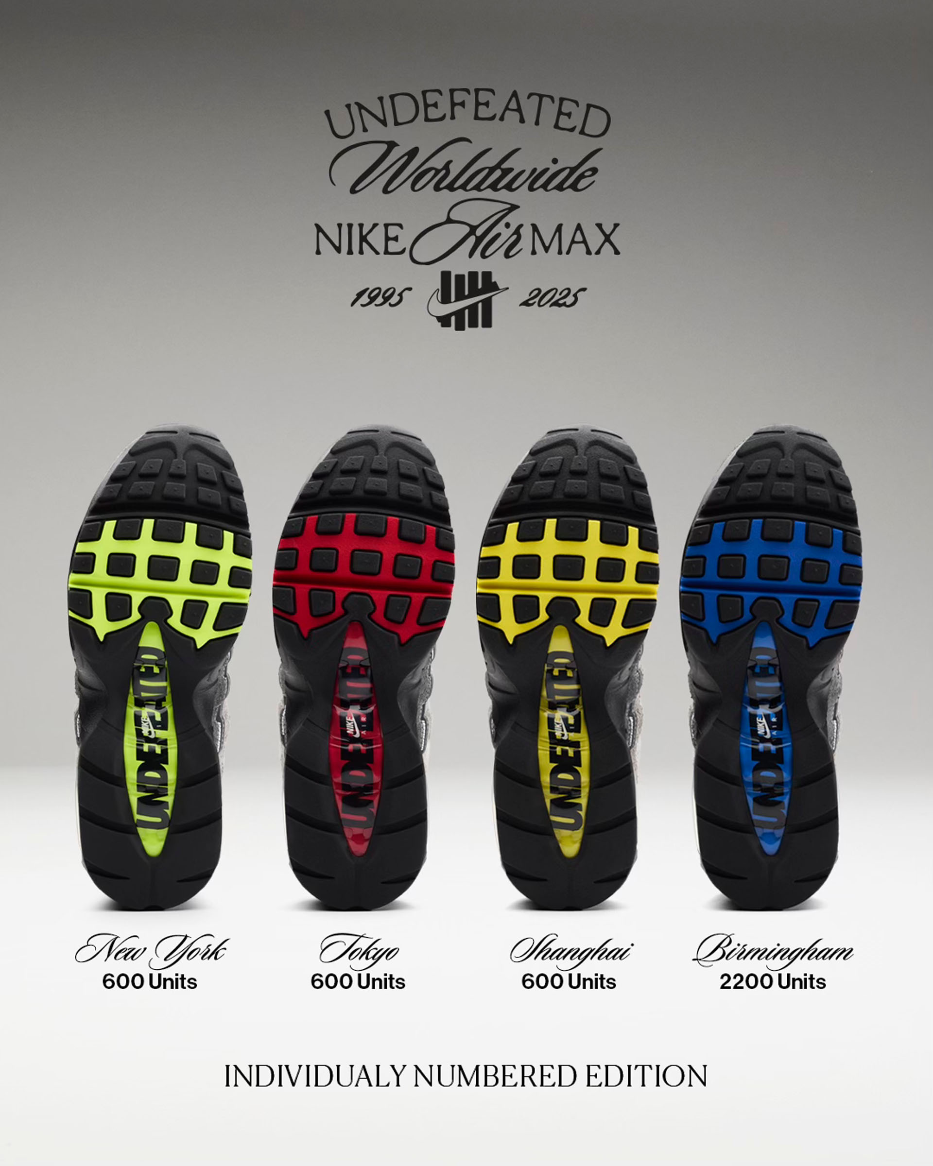 「Black」と「Sail」世界共通エディションの発売に続き、UNDEFEATEDはコラボレーションを拡大し、地域限定のグローバルなAir Max 95シリーズを展開。各モデルは個別にシリアルナンバーが刻印された限定品であり、実店舗でのみ販売される。