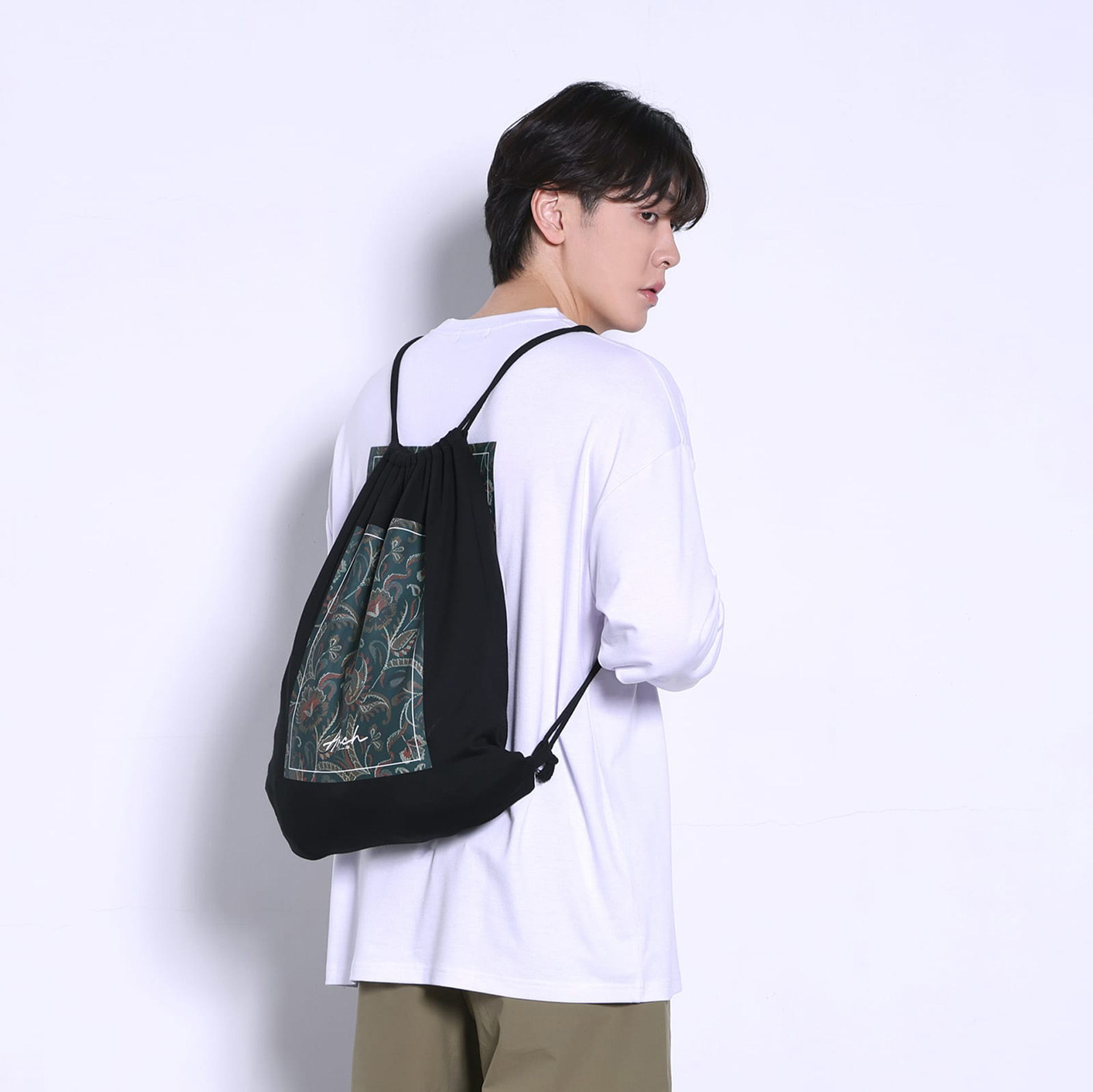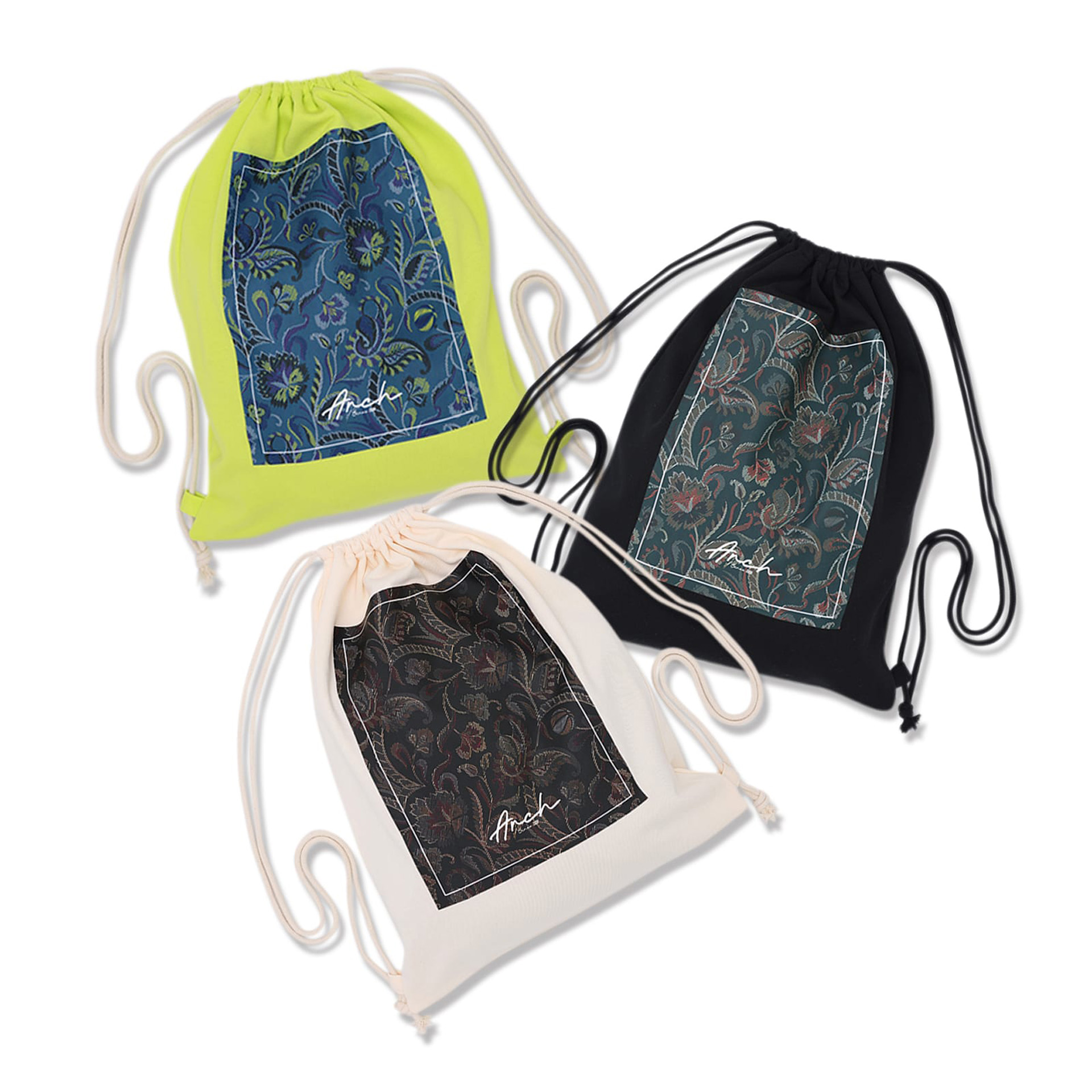 絵画のように複雑な織物技法 “ゴブラン織” をモチーフにしたデザインをBOX型でプリントした、スウェット生地のジムサック。ウェアやシューズなど数アイテムを一緒に収納できる、便利な大きめサイズ。タウンユースにもおすすめのラグジュアリーな織物柄デザインが魅力。