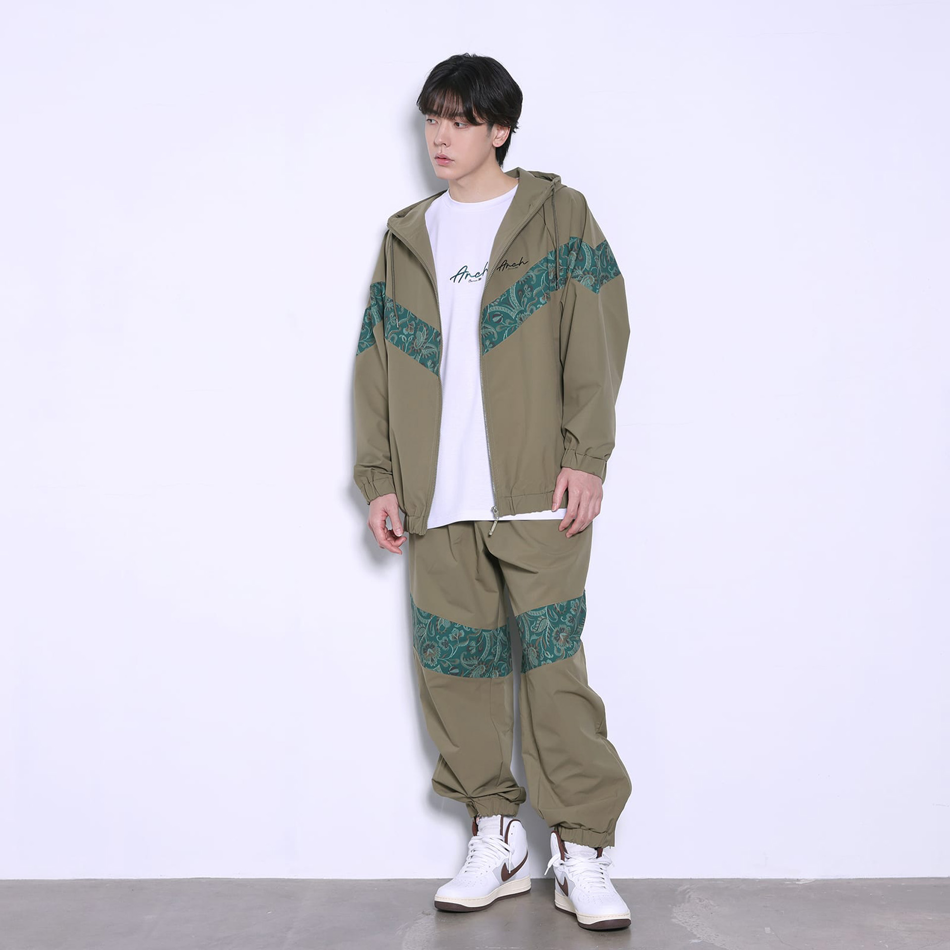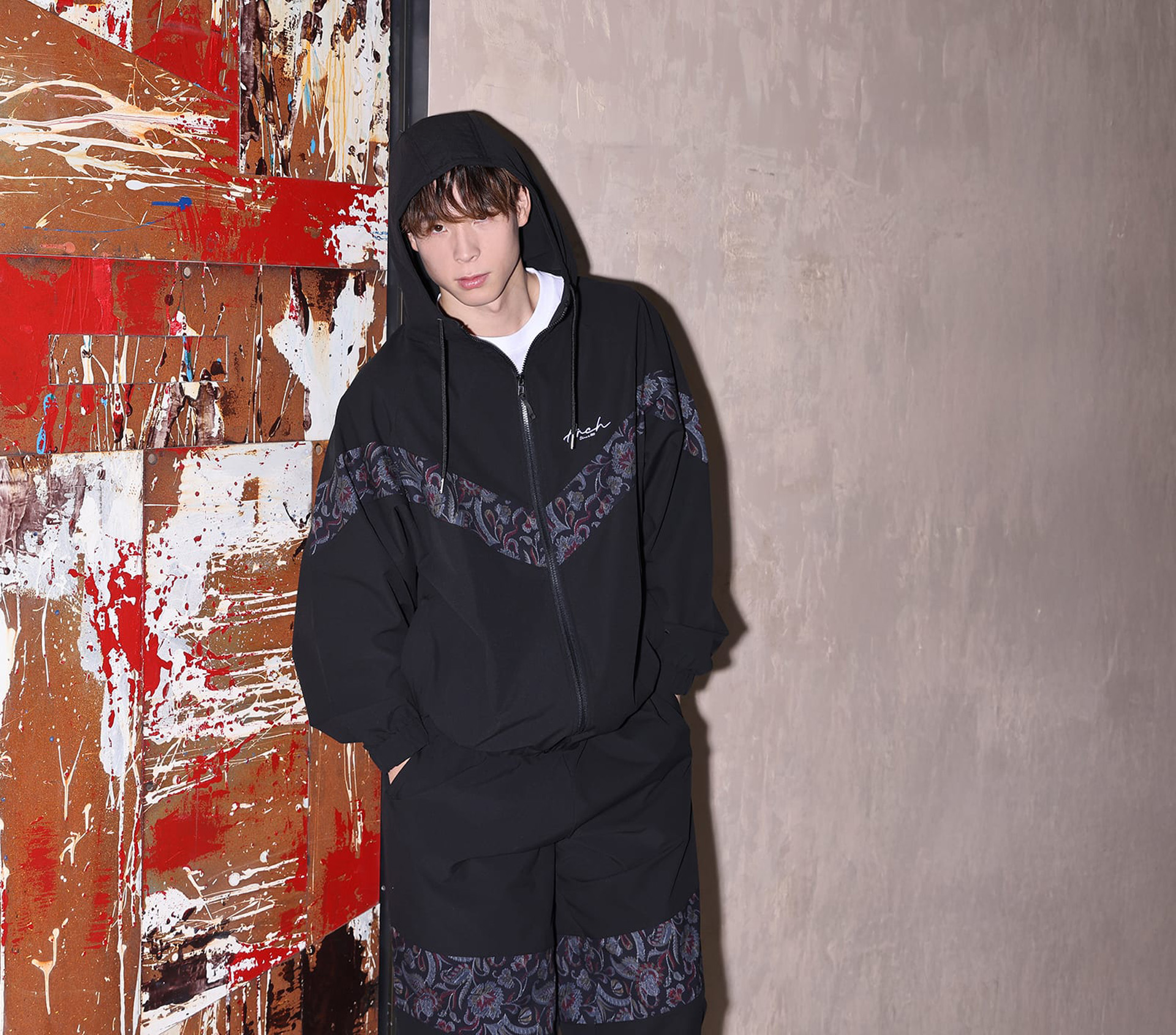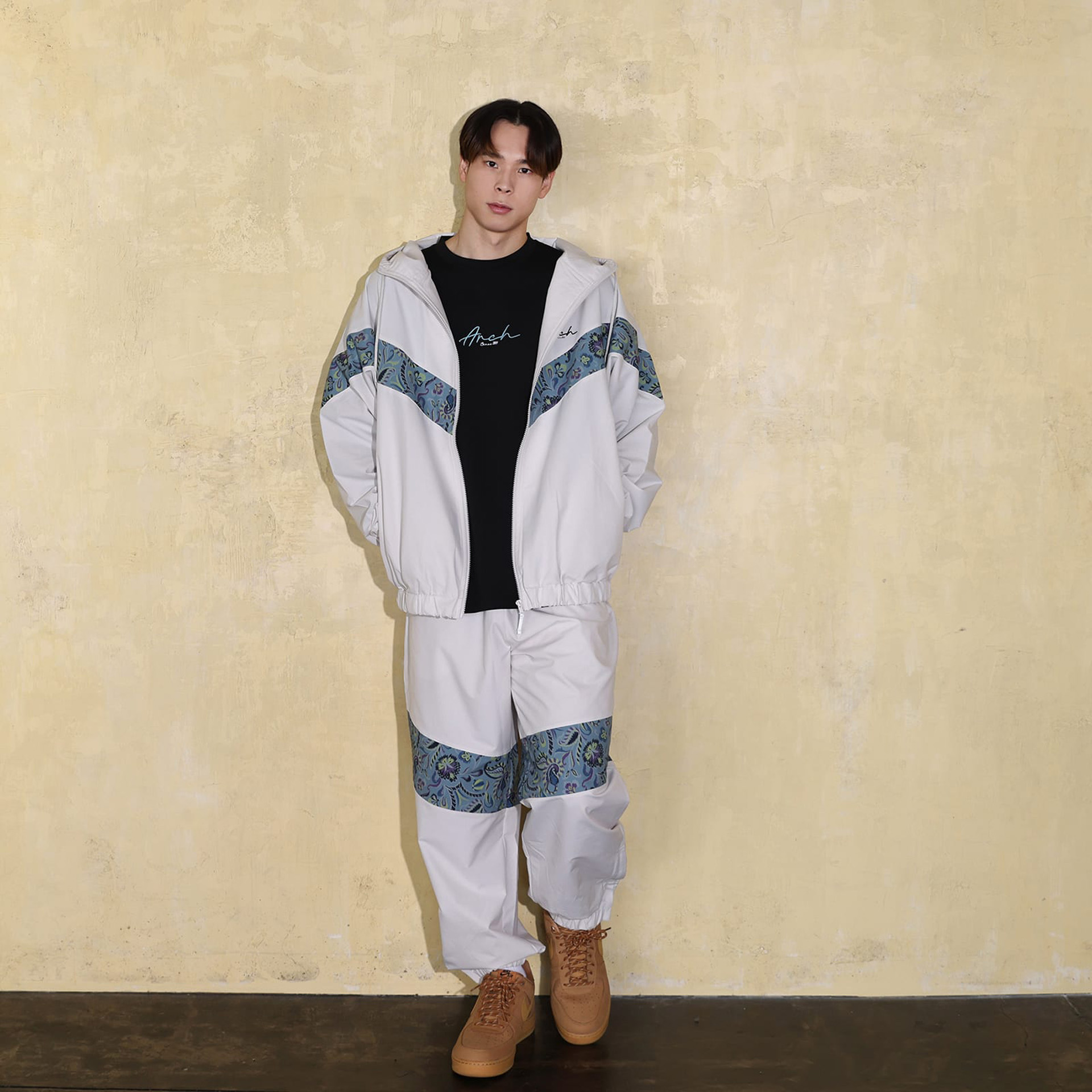 織物技法のゴブラン織をモチーフにしたデザインをラインで配置した、高品質のトラックジャケット。オールシーズンにサラリと着られるよう、あえて裏地のメッシュライナーを排除。カジュアルさを演出するワイドシルエットを採用。