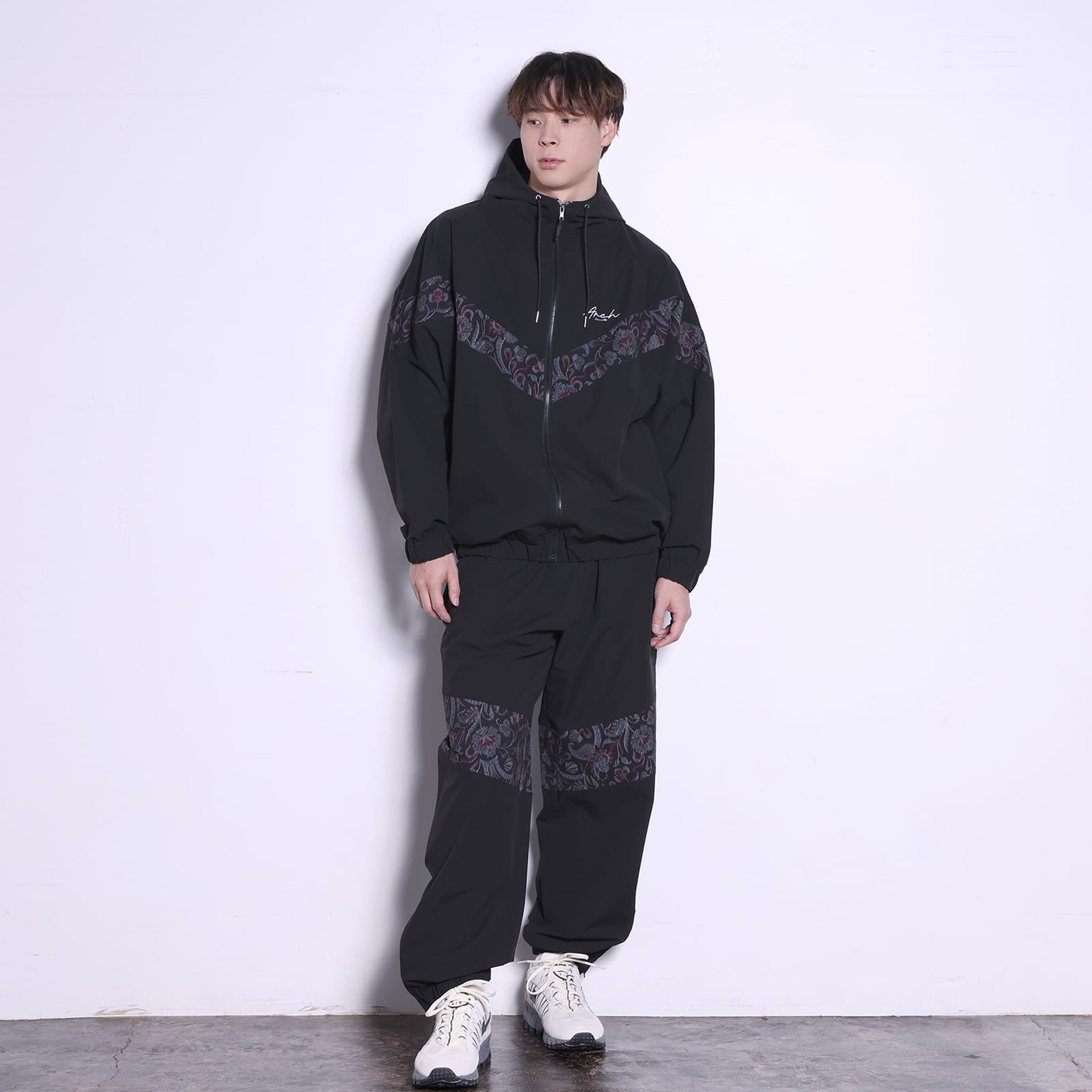 織物技法のゴブラン織をモチーフにしたデザインをラインで配置した、高品質のトラックパンツ。裾はゴム仕様で保温性に優れ、、サイドにはファスナー付で脱着もスムーズ。軽量でマットな質感のポリエステル素材を採用。