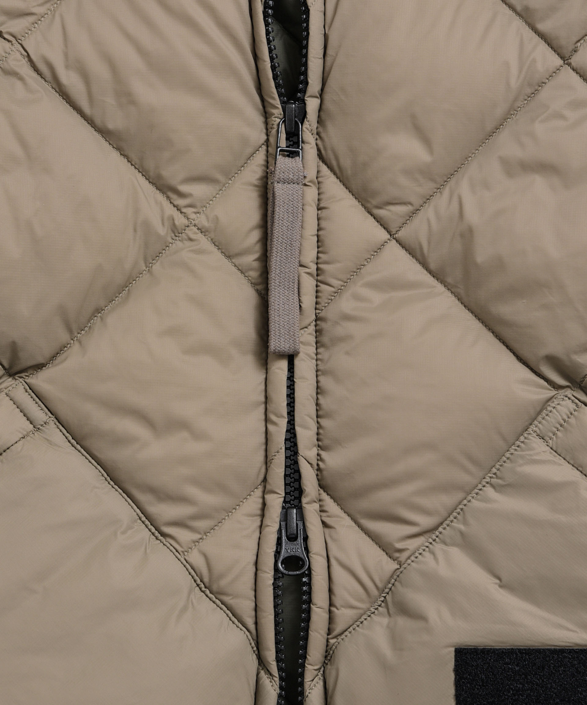 スタンダードなリブ襟とリブ袖により、あらゆるシーンで着用できる万能アウター。両脇のスリットはファスナーで開閉ができ、シルエット調整が可能で、ライトアウターとしても冬場のインナーダウンとしても活躍します。シンプルでユニセックスに使いやすいデザインに、ミリタリー要素をさりげなく融合させています。