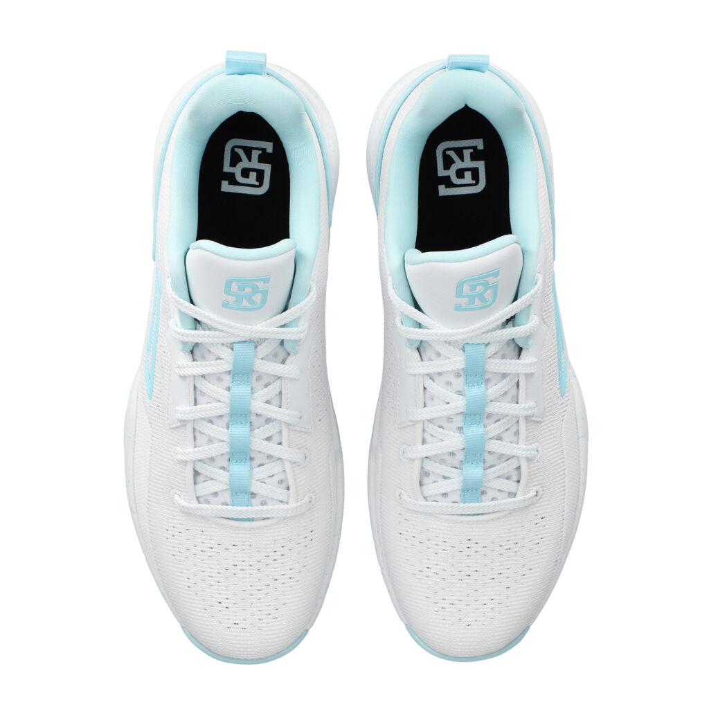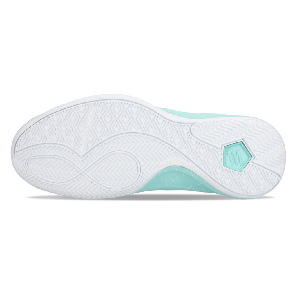 前⾜部は「コートを掴む感覚」を最⼤限に活かすために⾜裏と地⾯の距離を近く設定し、より瞬発的な動作を可能に。ミッドソール全体はEVA(合成樹脂)を採⽤、前後2箇所にEVAとは硬度の異なるEGOZARUの独⾃開発⾼反発フォームEGO DOOON(エゴドーン)を配し、前⾜部は接地感を損なわない適度な反発性を、踵部は安⼼感のあるクッション性を体感できる設計。さらに、中間層にねじれを抑制するシャンクプレートを内蔵することで安定感のある履き⼼地を実現。