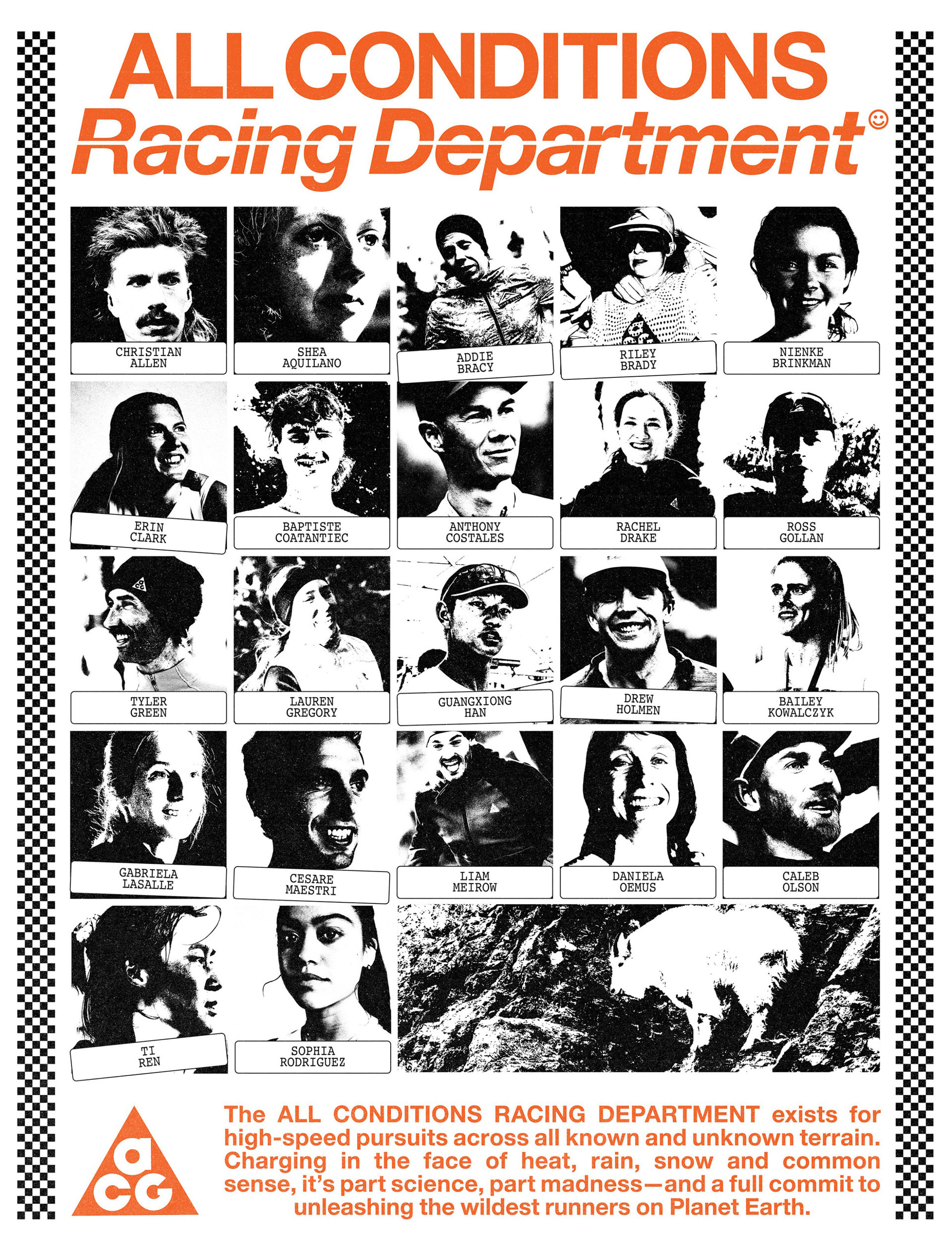 ACGのアウトドア アスリートへのフォーカスは、自然の声に耳を傾け、スピードに挑戦するエリート トレイルランナーが集う オール コンディションズ レーシング デパートメントにも広がります。既存の22名のメンバーに加えて、今シーズンは甲斐大貴選手と高村貴子選手の2名の日本人を含む下記の6名が新たに参加し、オール コンディションズ レーシング デパートメントはACGと協力し合い、試作品をテストし、改良を加えながらトレイルコミュニティのためのパフォーマンスの未来の開拓に取り組みます。