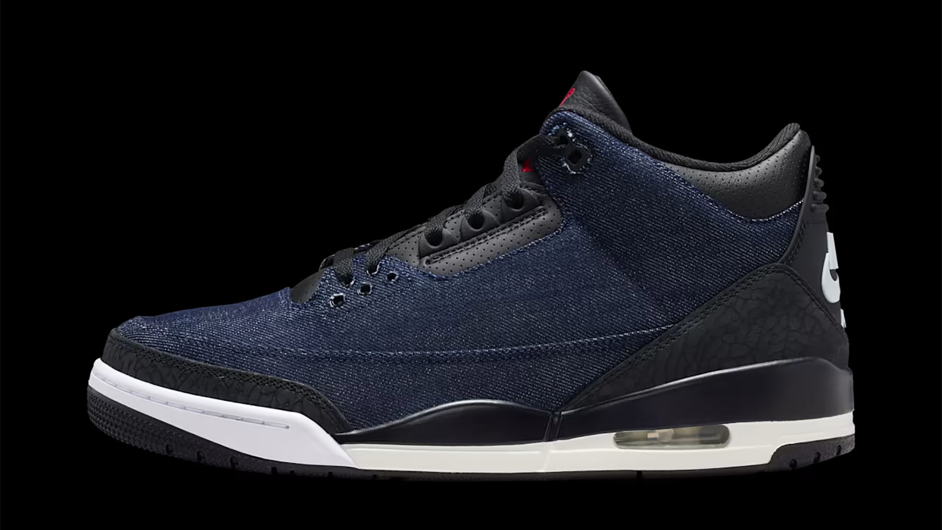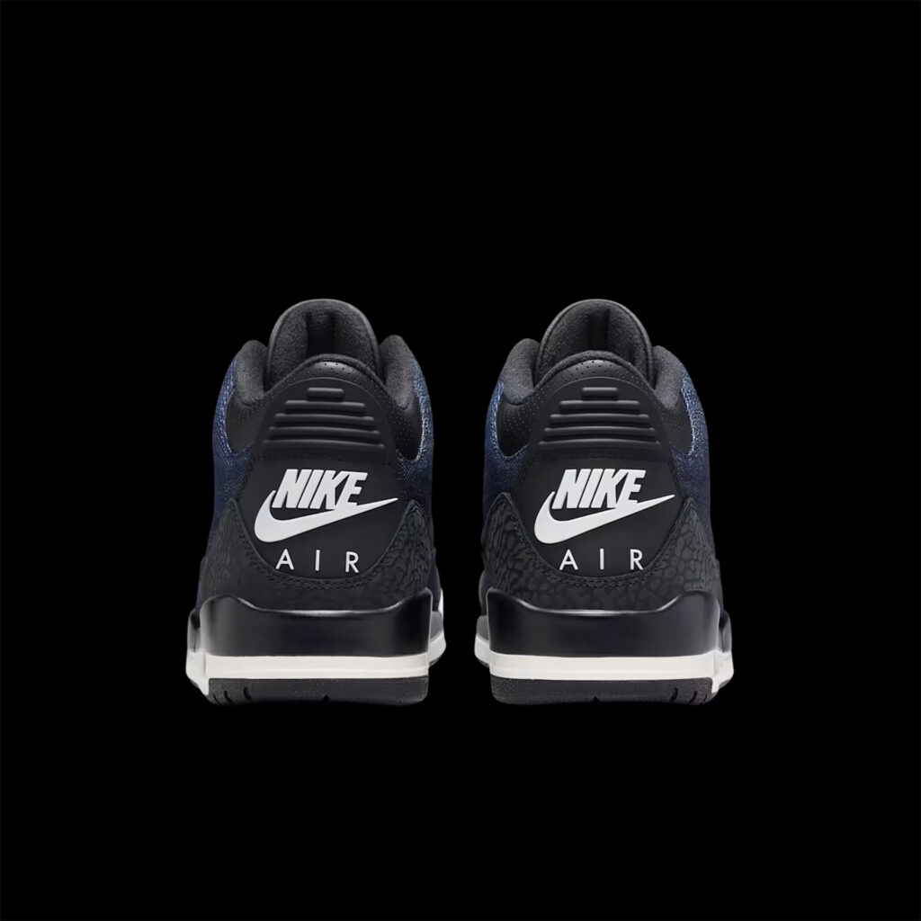 Jordanとリーバイス®が再びタッグを組み、エア ジョーダン 3を斬新にアレンジ。アッパーにはプレミアムなインディゴデニムのパネルに同系色のブラックで施したエレファント プリントを組み合わせ、洗練されたダークウォッシュの仕上がりに。リーバイス®を象徴する1ドル紙幣のモチーフに、アイレットに施したレッドタブと、アウトソールとソックライナーにあしらった揃いのディテールが調和する。