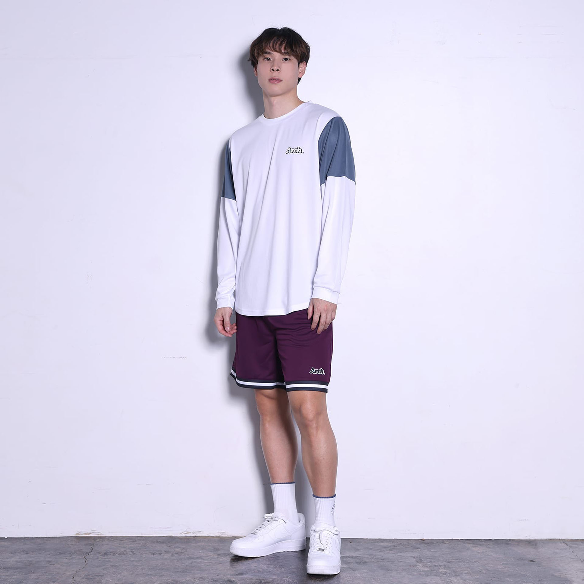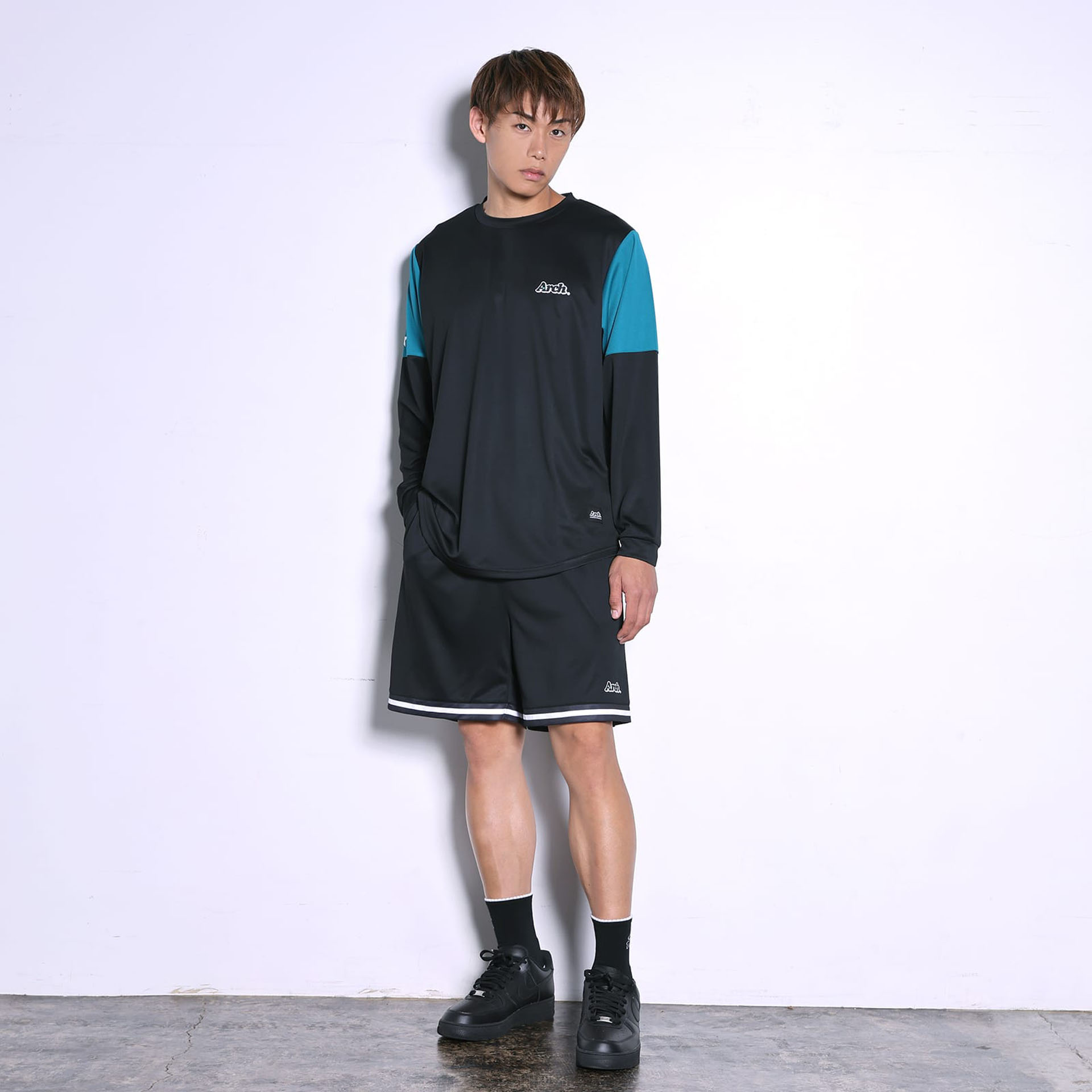 両腕のカラー切り替えが特長のDRY-L/S Tシャツに、それとセットアップでも楽しめるラインのデザインが特長のショーツ。