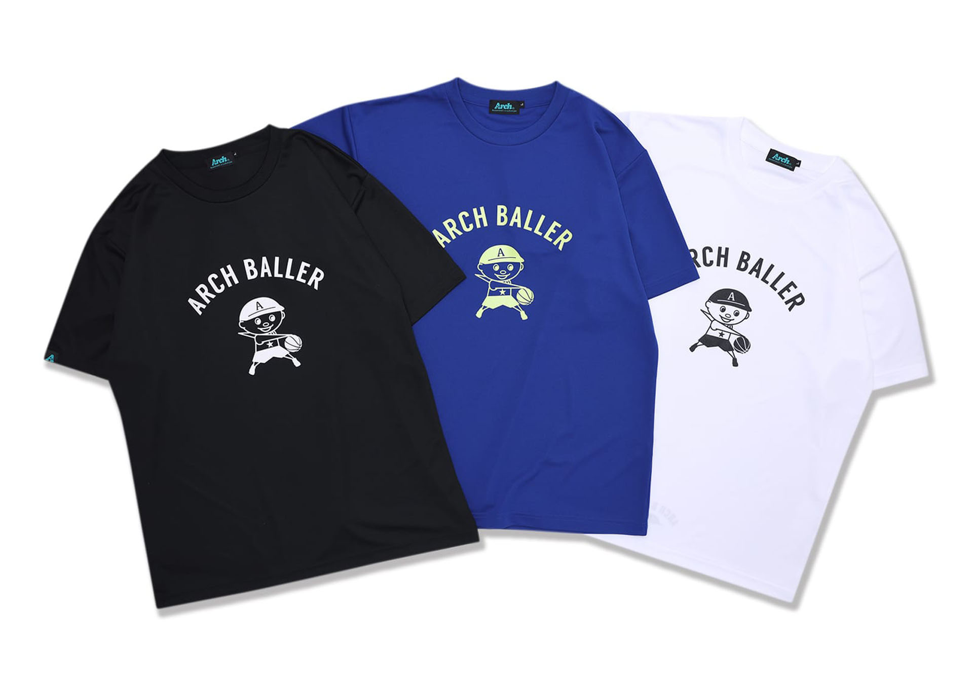 さらに、ARCH BALLERキャラが「シャムゴッド」をする姿をプリントしたDRY-Tシャツ、バスケ好きのドーナツカフェ・ショップを描いたコットンTシャツ、「playful logo」を両サイドに配置したNEWデザインのショート丈ソックスも登場。