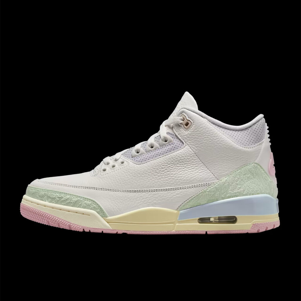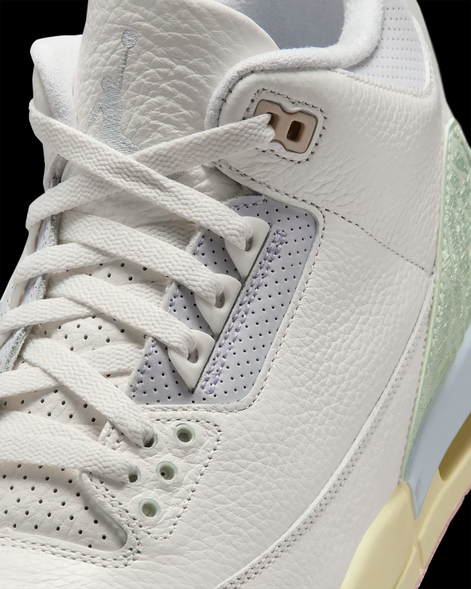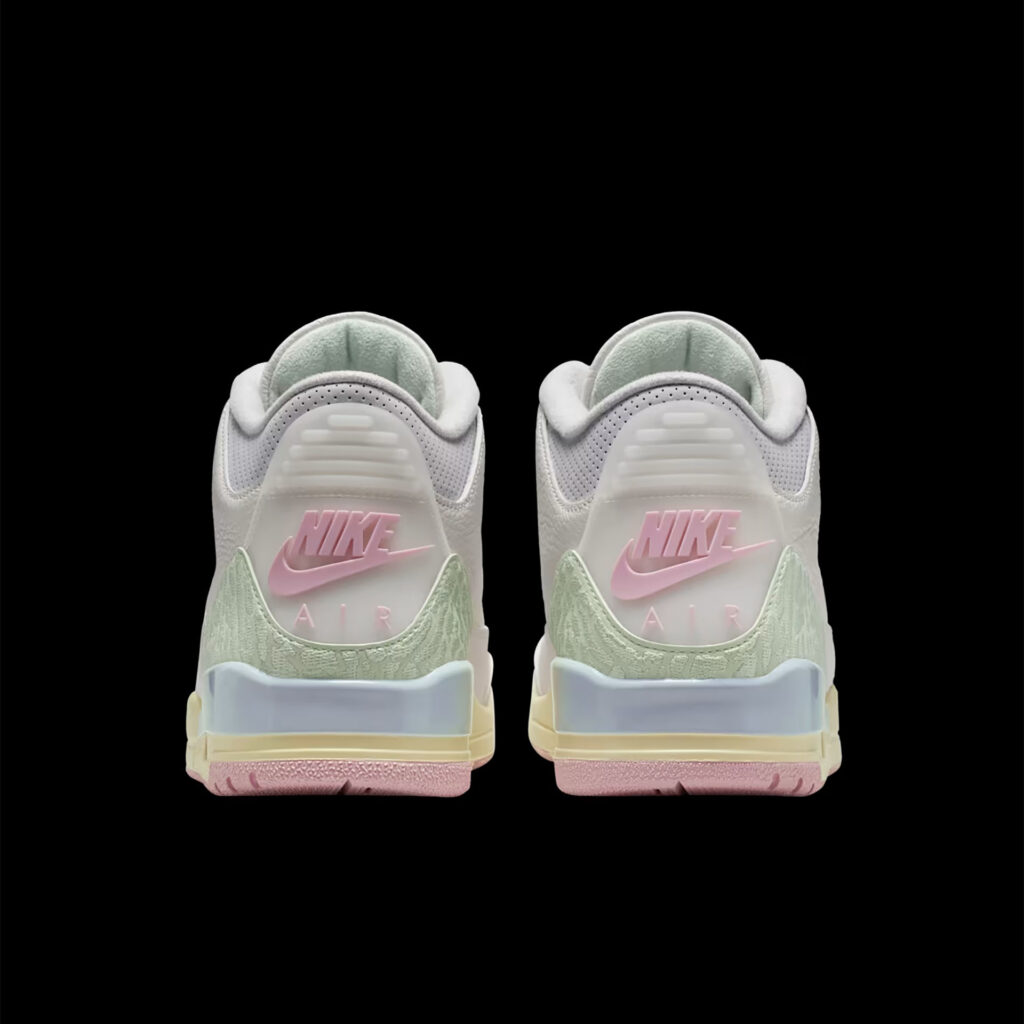 春に咲く花々よりも爽やかなカラーをまとったジョーダンが登場。セイルカラーの張りのあるレザーをキャンバスに、ジェイドオーラとアイリスウィスパーのディテールがアッパーを取り囲むように咲き誇る。ロゴとアウトソールに施されたオーラピンクが全体をまとめ、象の肌を思わせるプリントを刺繍したかかとのデザインが繊細な印象をプラス。