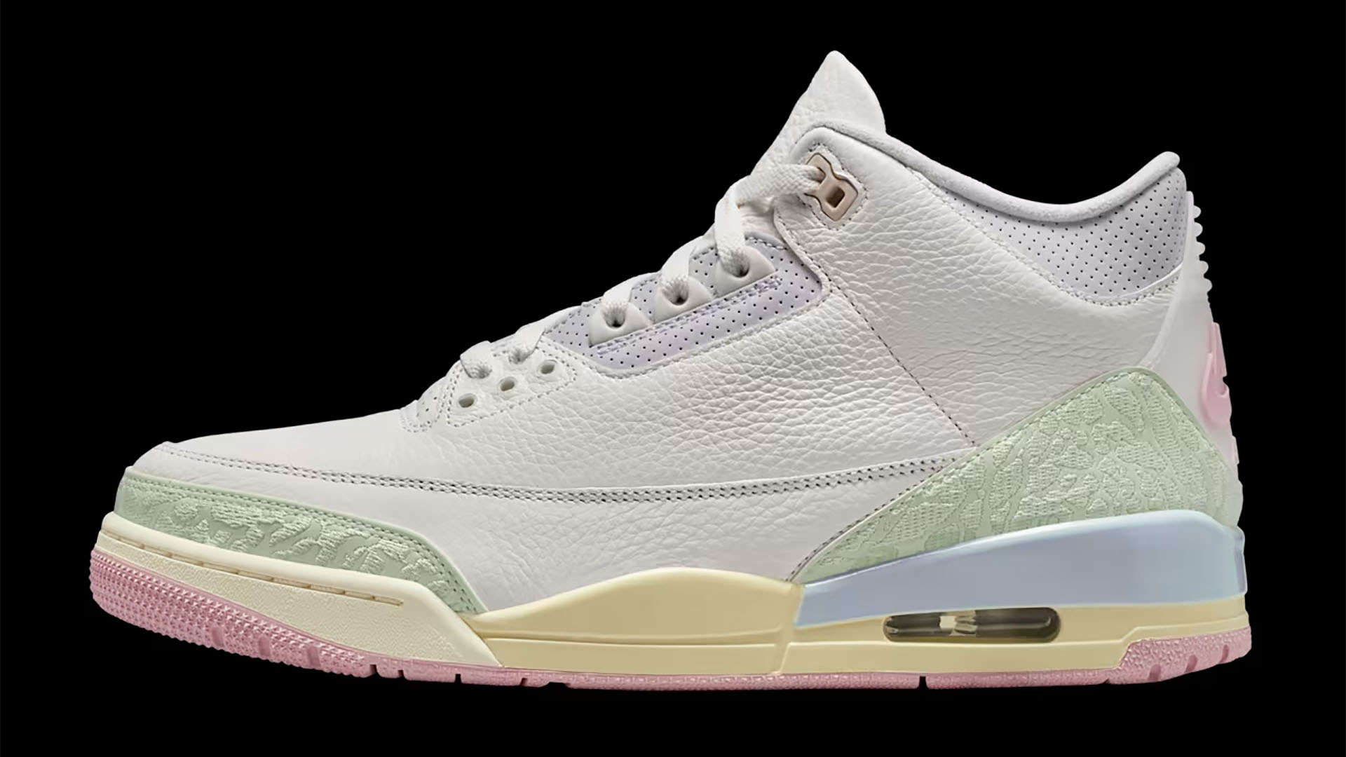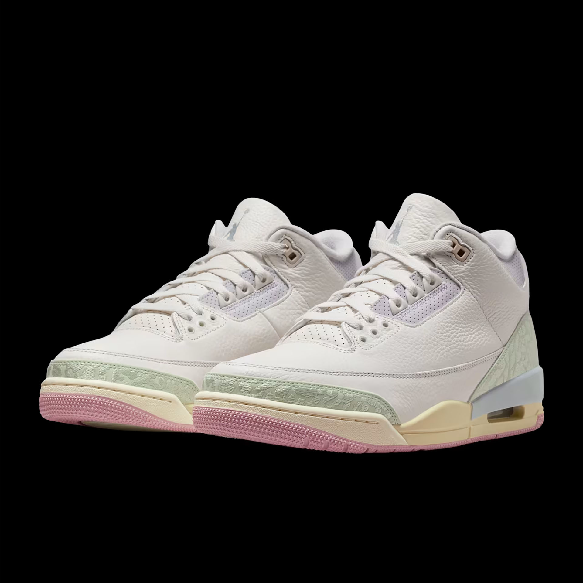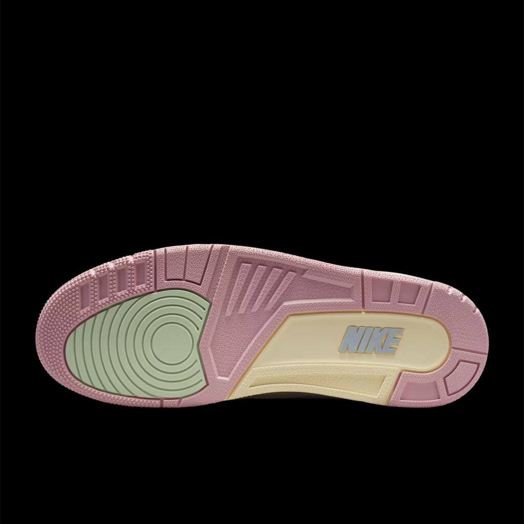 春に咲く花々よりも爽やかなカラーをまとったジョーダンが登場。セイルカラーの張りのあるレザーをキャンバスに、ジェイドオーラとアイリスウィスパーのディテールがアッパーを取り囲むように咲き誇る。ロゴとアウトソールに施されたオーラピンクが全体をまとめ、象の肌を思わせるプリントを刺繍したかかとのデザインが繊細な印象をプラス。