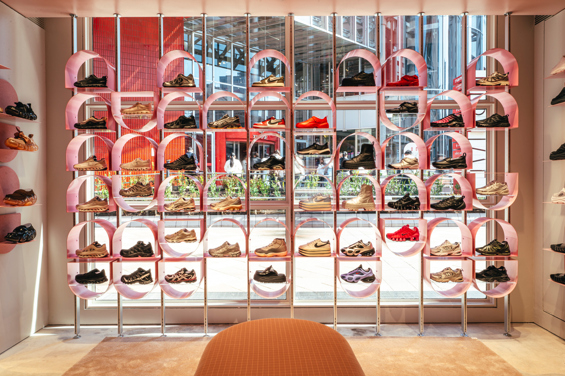 店内は落ち着いたピンクを基調とし、唯一無二の円形デザインが特徴のスニーカーウォールや、Head to toe でスタイリングをイメージできるアパレルウォールを設置。ゆっくりとお買い物が楽しんでいただけるよう大きなソファも用意され、ブティックのような空間となっている。