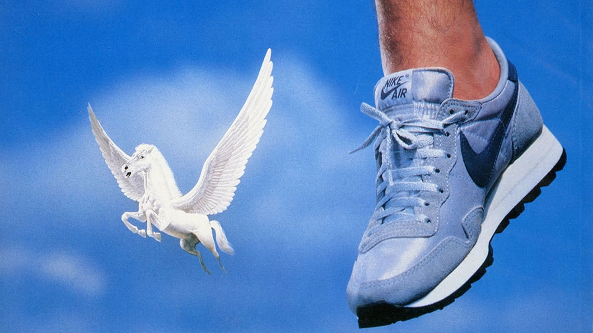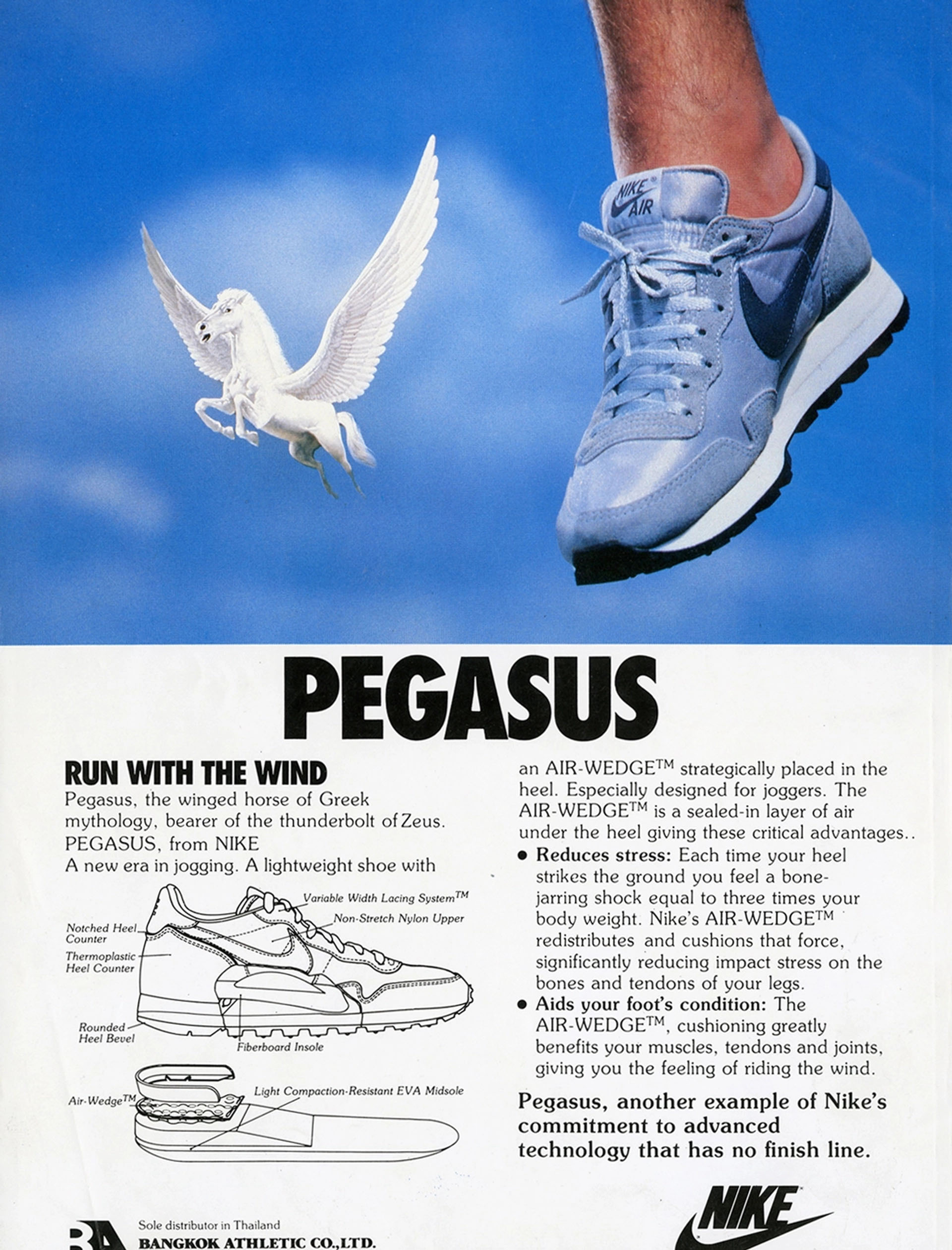 1983年の「Run With the Wind」広告に見られるように、初期のナイキ ペガサスのプロモーションでは、翼のある馬をモチーフに、ヒール部分のエアがもたらす軽やかで浮き上がるような履き心地を視覚的に表現しています。