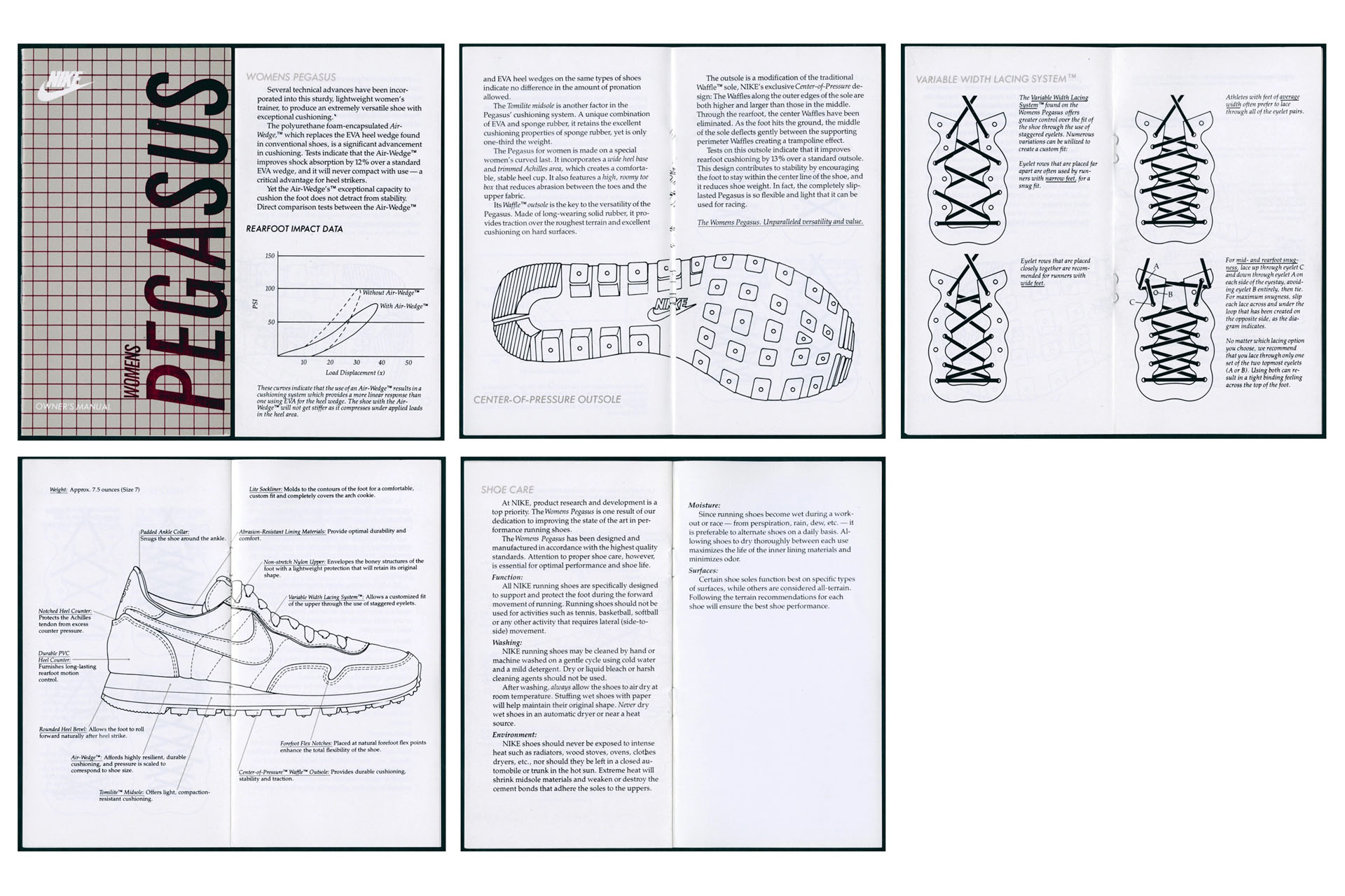 ペガサスに対するナイキの自信は、細部にも表れていました。当時、ナイキは注目度の高いモデルに「オーナーズ マニュアル」を同梱し、新しいテクノロジーをランナーにわかりやすく伝える取り組みを始めており、ペガサスにも同様のマニュアルが用意されていました。そこでは、エアやトミライト、そしてシューズの構造について丁寧に解説されていました。こうした透明性のある情報提供は、ペガサスが、明確さ、実用性、信頼の上に築かれた1足であることを、より強く印象づけました。