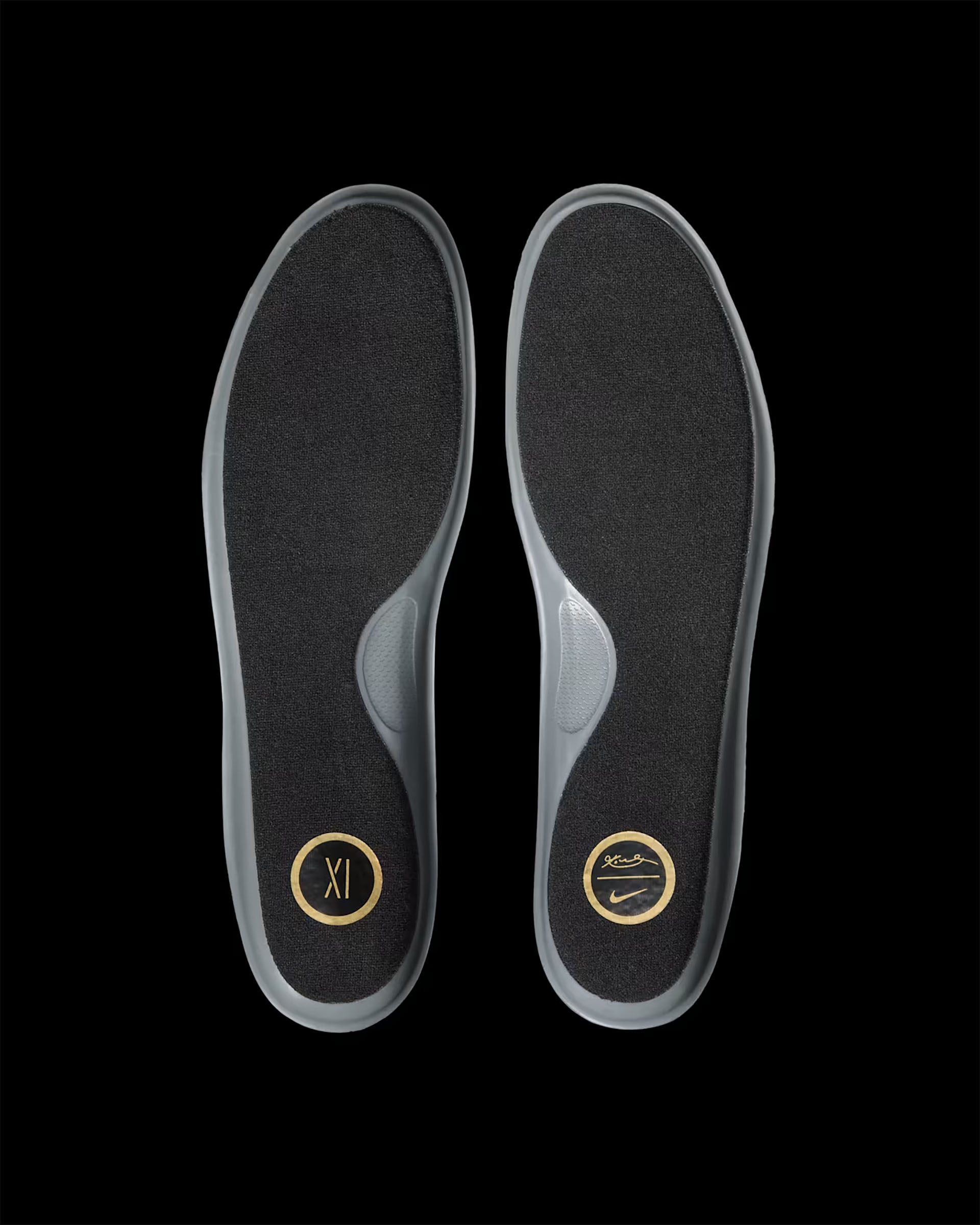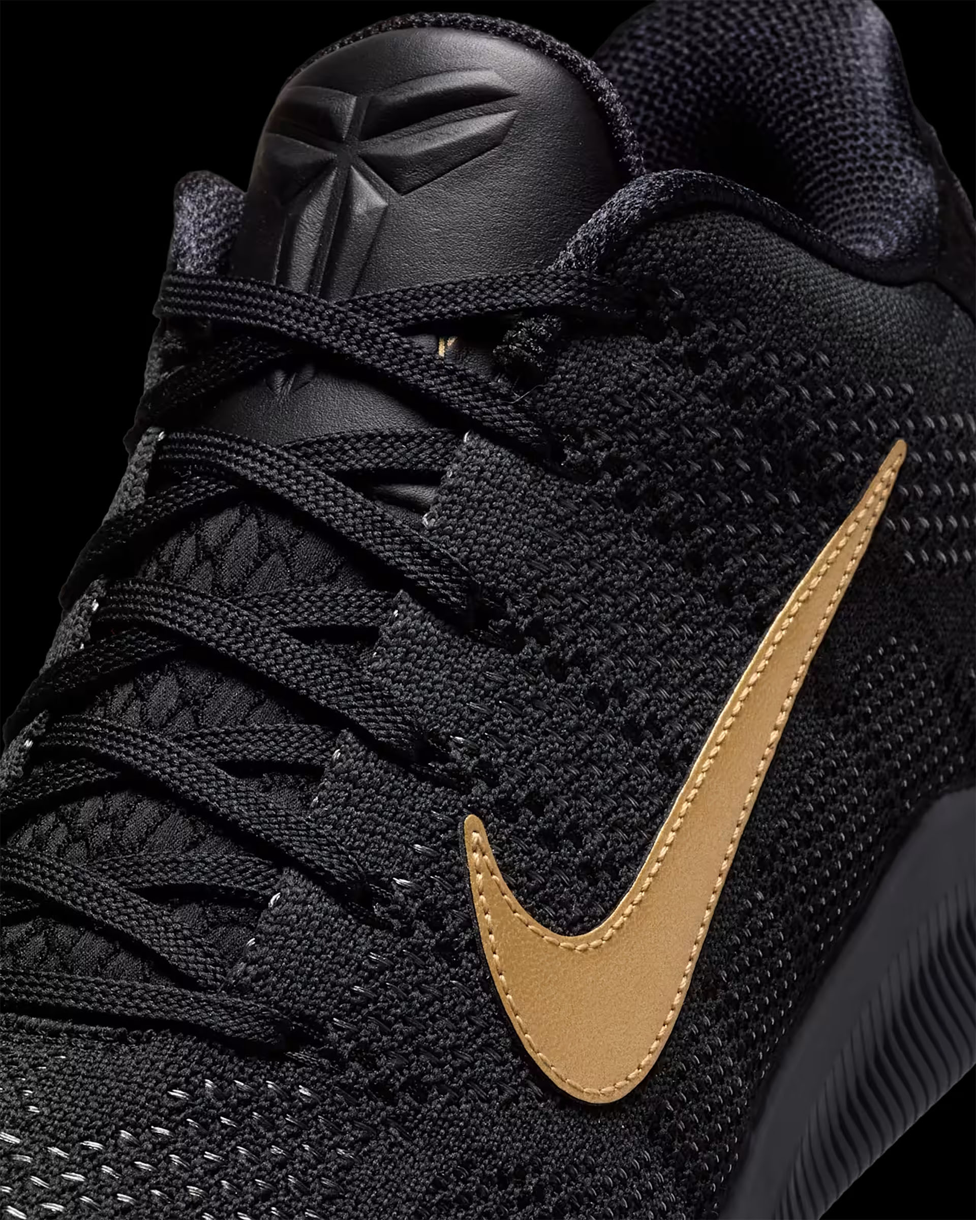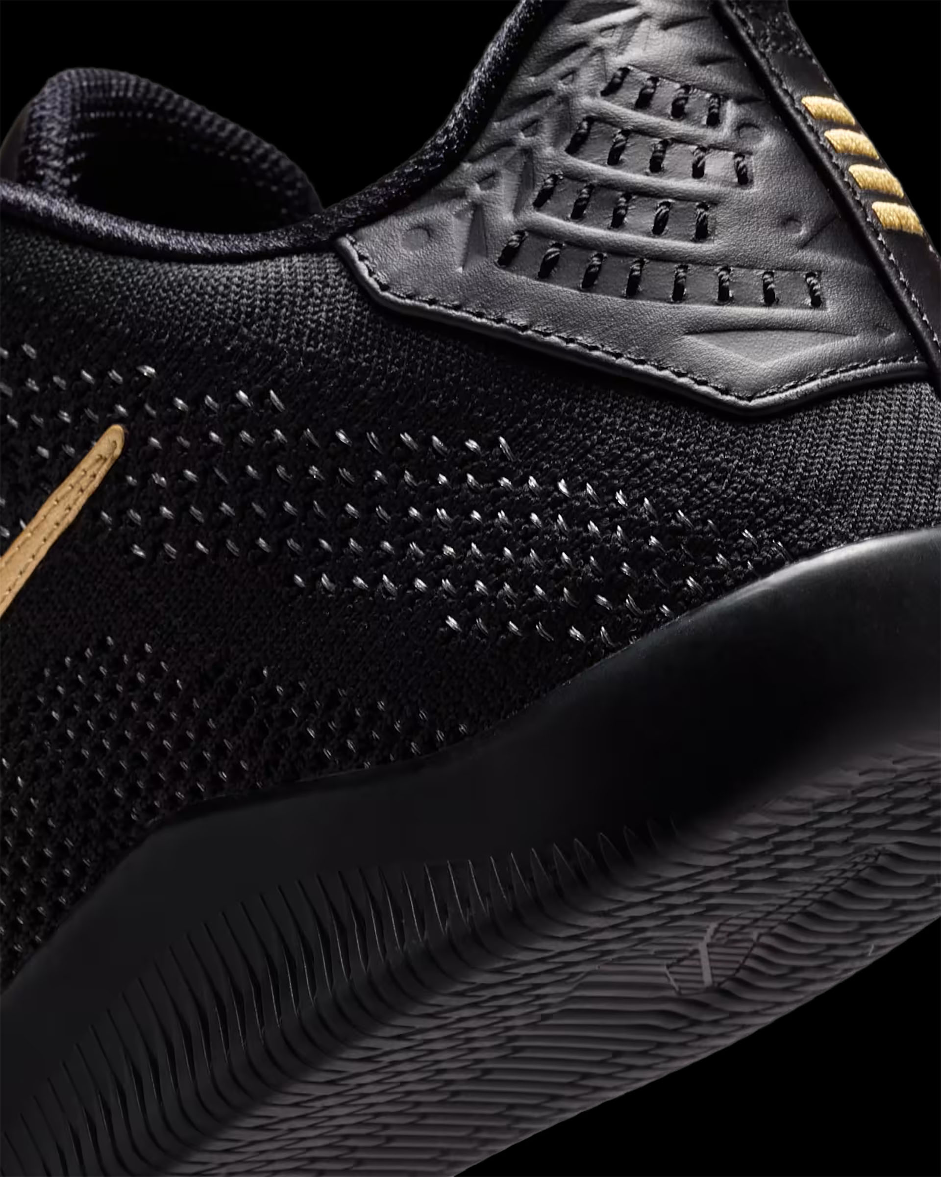 ブラックのFlyknitアッパーを全体にあしらわれたメタリックゴールドのアクセントと組み合わせたデザイン。オリジナルのコービー 11で使われていたLunarlonフォームをReactXドロップインミッドソールで置き換えつつ、かかと部のAir Zoomユニットはそのままに。この組み合わせで高反発のクッショニングを実現した。外側についてはアウトソールのトレッドパターンを見直すことで、優れたトラクションとコートへの接地感が得られた。