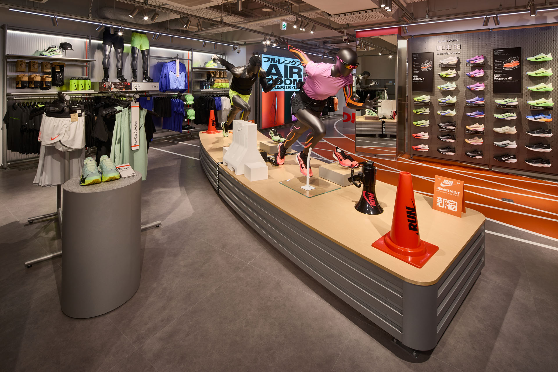 「NIKE SHINJUKU」は、世界一のターミナルである新宿のトラフィックを想起させ、店内を巡るのが楽しくなるようなポップなフロアマップ デザイン、陸上用トラックのコースがフロアデザインに組み込まれるなど、アスリートにスポーツのインスピレーションを与え、必要なギアが揃えられるようにデザインされています。また、「NIKE SHINJUKU」では「ウィメンズ」、「メンズ」などでフロアやエリアを区分しておらず、それぞれのスポーツ カテゴリーの取り扱い商品の中から、シームレスに自分の気に入ったプロダクトを探すことができます。ランニングエリアには登場したばかりのナイキ ペガサス 42も取り揃え、最新のアイテムも充実しています。また、アウトドアを楽しむための挑戦や冒険、繋がりを求めるすべてのアスリートのためのアウトドア パフォーマンスブランドとして刷新されたACG(All Conditions Gear)が1階フロアに登場します。