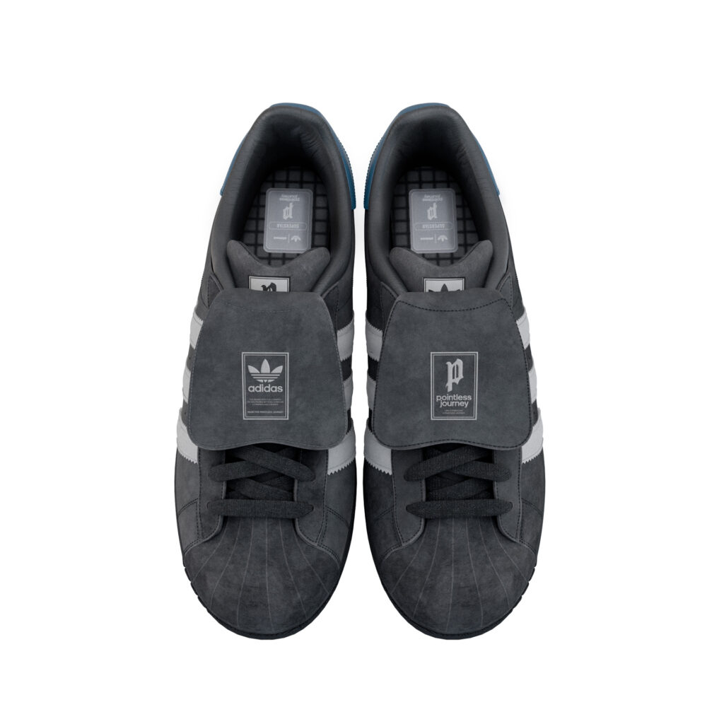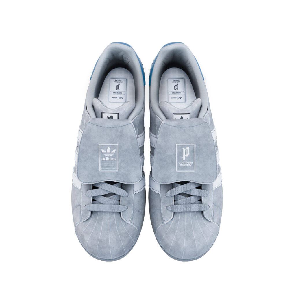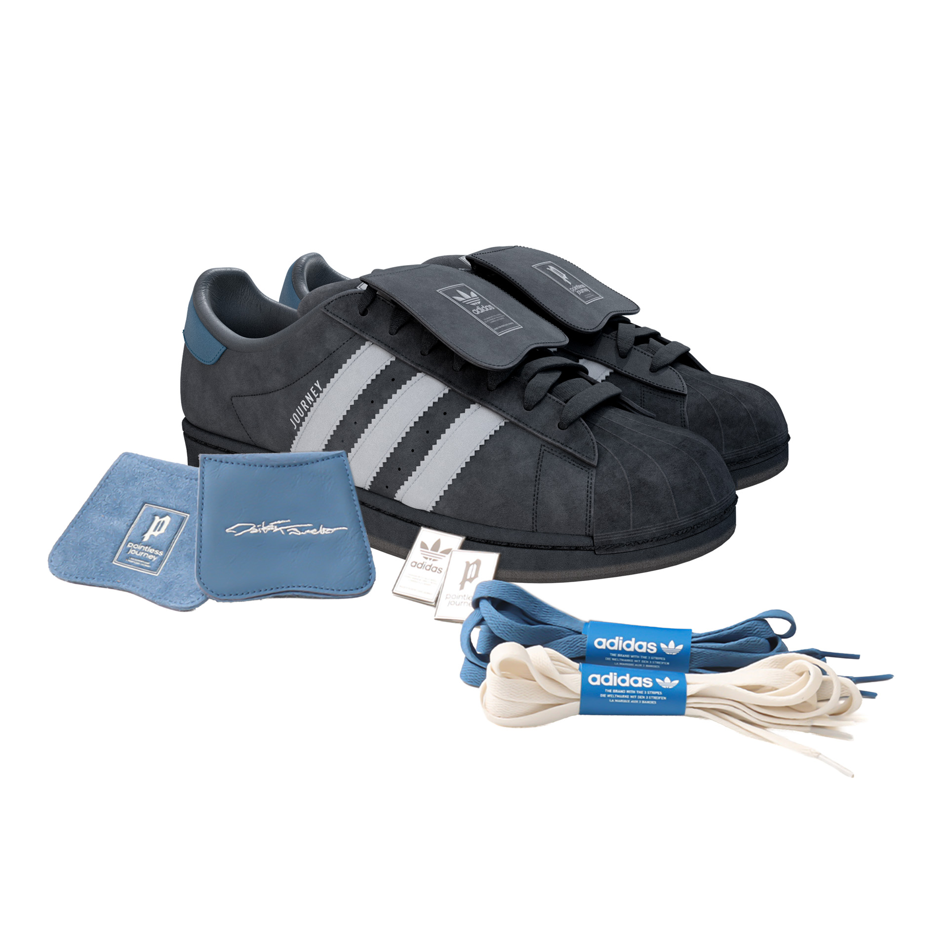 ディテールにも常田氏の美意識が随所に反映されており、シュータン裏には本人のサインを刺繍。取り外し可能な2種類のロングシュータン(同色仕様/ヒール部に配色アクセントを加えた仕様)を付属し、着用者の感性に応じたアレンジが可能。サイドには通常の「SUPERSTAR」ロゴに代えて「POINTLESS JOURNEY」の刻印を採用し、付属品として2組のシューレースとカスタマイズ用のメタル製シュータン グラフィックピン(2種)を同梱。細部に至るまで、着用者自身が完成させることを前提に設計された一足となっている。