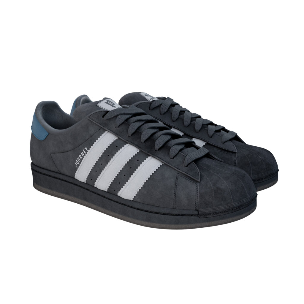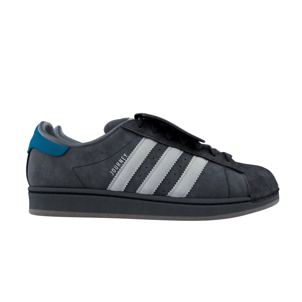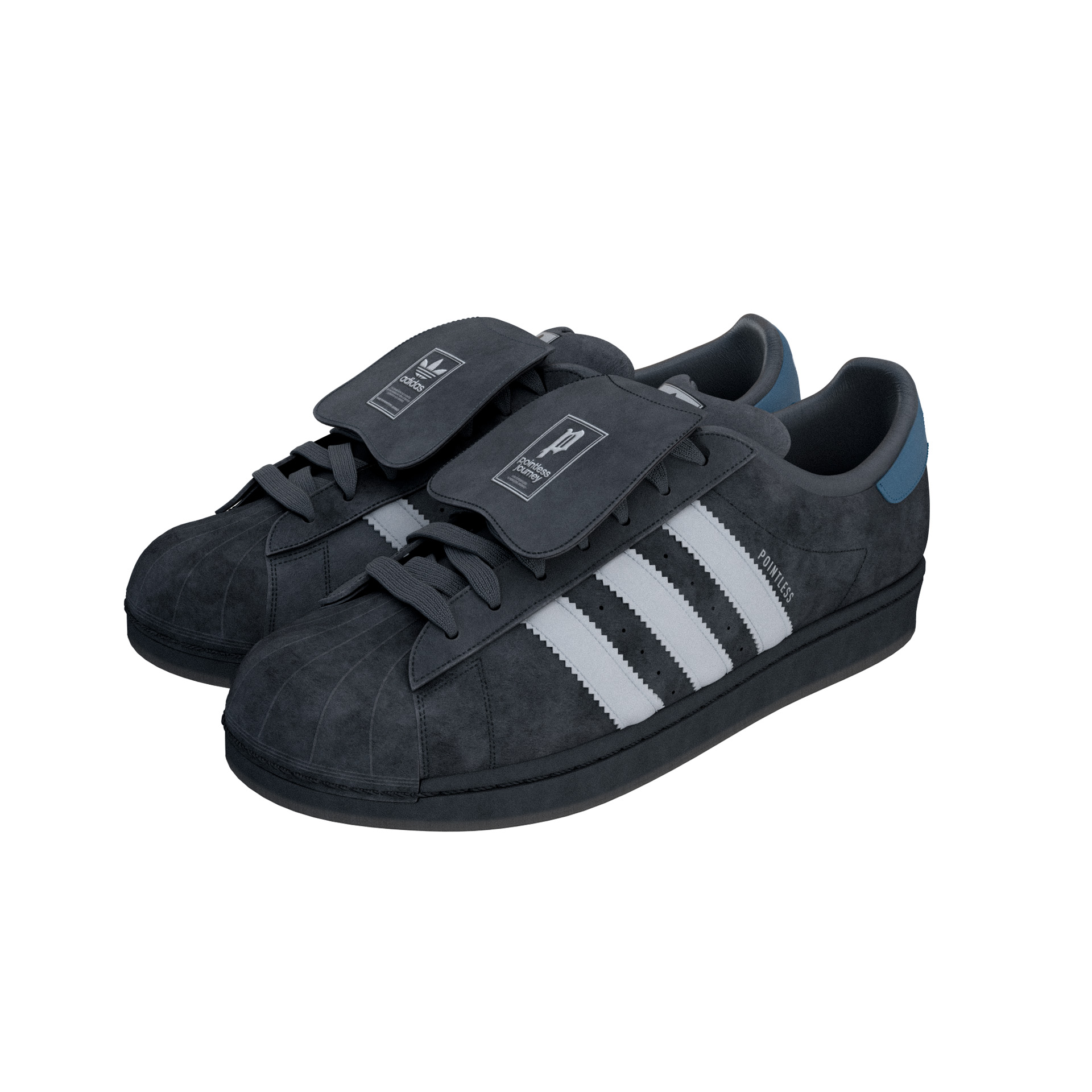 ディテールにも常田氏の美意識が随所に反映されており、シュータン裏には本人のサインを刺繍。取り外し可能な2種類のロングシュータン(同色仕様/ヒール部に配色アクセントを加えた仕様)を付属し、着用者の感性に応じたアレンジが可能。サイドには通常の「SUPERSTAR」ロゴに代えて「POINTLESS JOURNEY」の刻印を採用し、付属品として2組のシューレースとカスタマイズ用のメタル製シュータン グラフィックピン(2種)を同梱。細部に至るまで、着用者自身が完成させることを前提に設計された一足となっている。